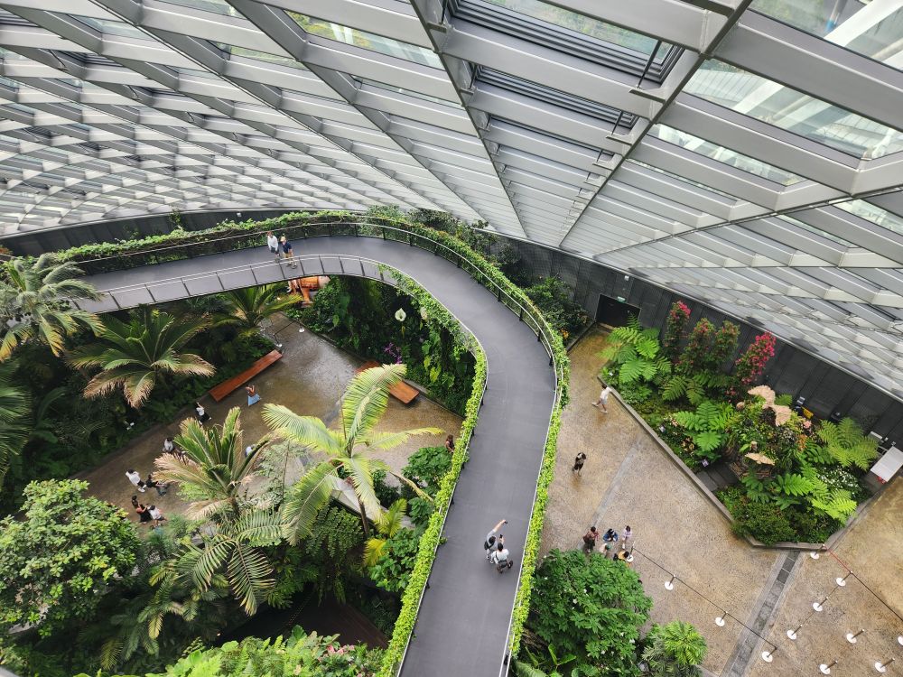 Exiting the elevator, we are shown to the stairs for the open-air rooftop with unrestricted 360 degree views all around the Gardens and out to the city in the distance. This alone is worth the price of admission! With the breeze, it is nice and cool and there are only 2 people up there besides us. Perfect. We spend a lovely and peaceful 10 minutes or so just walking around and enjoying the views.