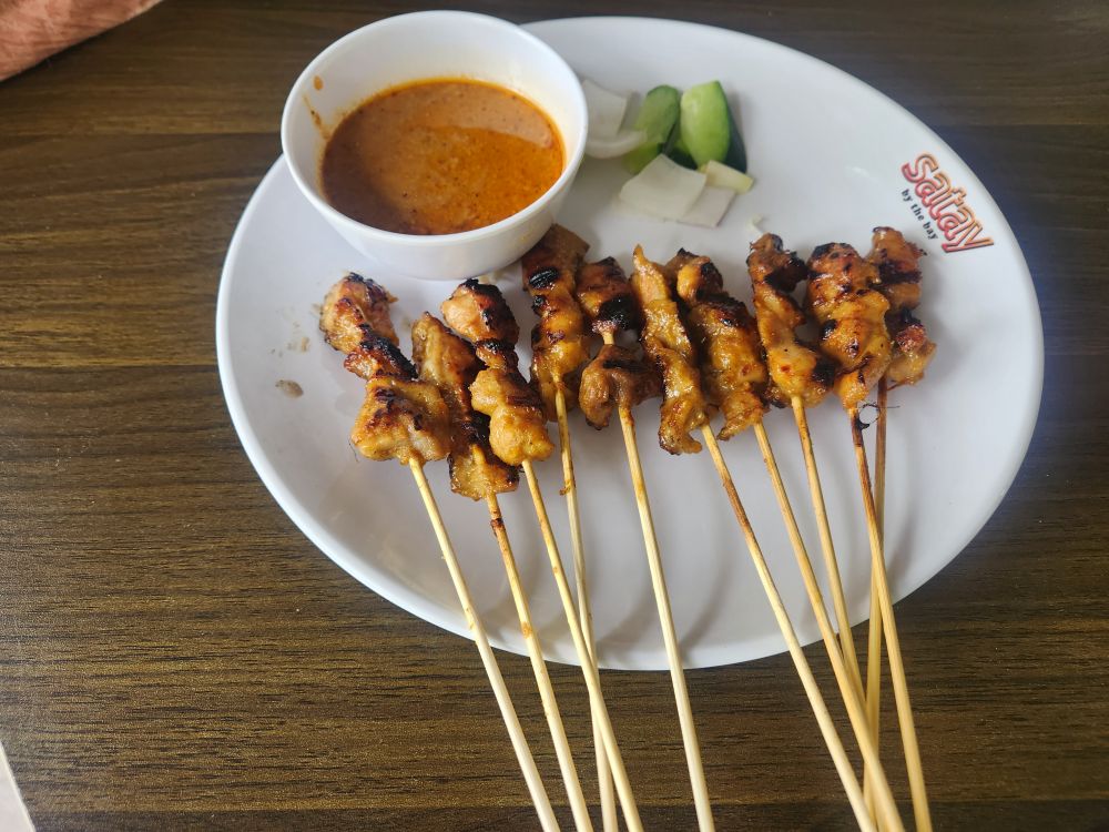 While definitely more sanitized than the normal Hawker’s stalls, there is still a huge variety of food options (even if a few of the stalls are owned by the same people). Satays dominate, as the name would suggest, and we aren’t going to pass those up. We have half an hour to wait before they open (even if it says they open at 11 in GoogleMaps), which we spend sitting at a table in the shade, editing our photos and keeping up with the world. At the appointed time, we order our first plates – fried chicken dumplings from Dumprince (cute, sort of? Or weird? Can’t decide – and yes we said satays, we’ll get to those), which come out about 5 minutes later, fresh and crispy and excellent. Next, the aforementioned namesake – satays. 5 chicken, 5 pork which are all quite tasty, with an excellent peanut sauce – just quite small portions. Then again – with all the food we have been eating, we really don’t need much more.