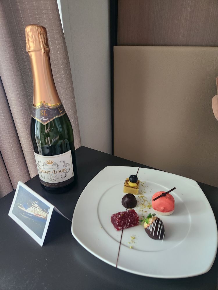Now we have some downtime before the gym, where we peruse the daily program and information that has arrived. Hmmm, the immigration and port information tells us we need our keycard, digital copy of our passport and our Indonesian Customs form. Huh? Has our itinerary changed and we don’t know it? Communications….just not their forte. As we are hanging out, there is a knock on our door. Fully expecting it to be Ratha checking in, we are surprised by a waiter with a tray of sweets and champagne. Huh? A note alongside says with Compliments of the Hotel Director. And that’s it. Okaaayyyy. Hey, we’re happy – a chocolate covered strawberry, awesome macaroon and other treats – but why? Maybe because we are back-to-back? Maybe because we are just such nice passengers? LOL. We’ll never know (refer to above communications forte), but it was a lovely little welcome back treat!
