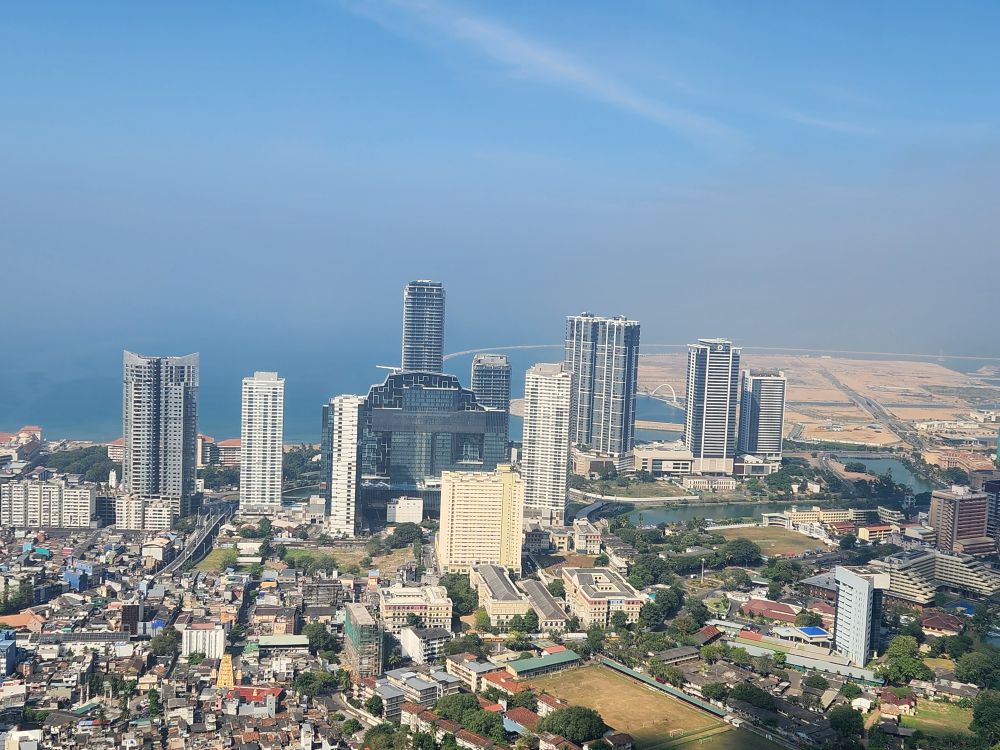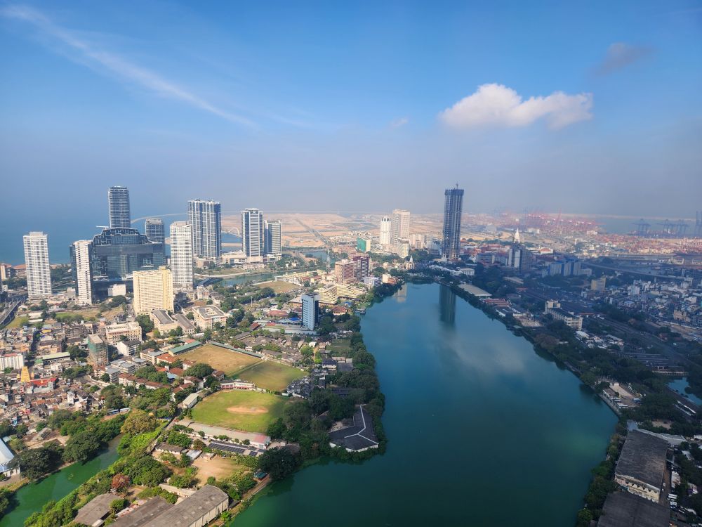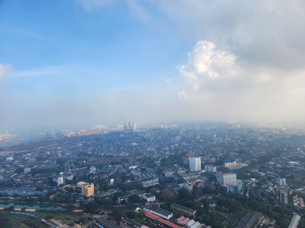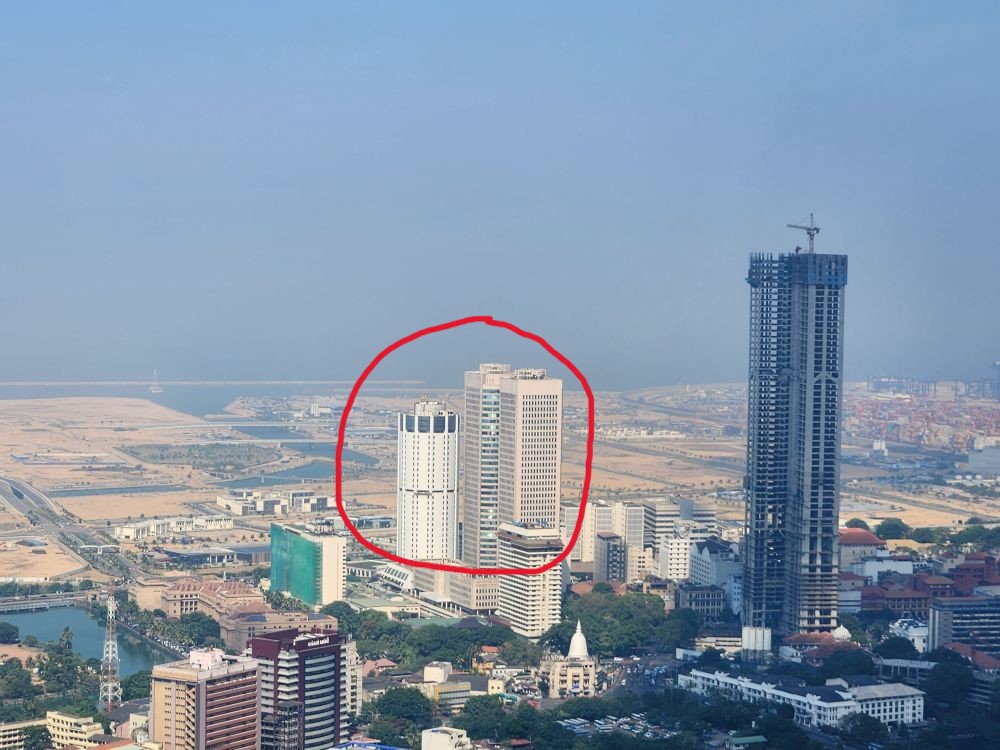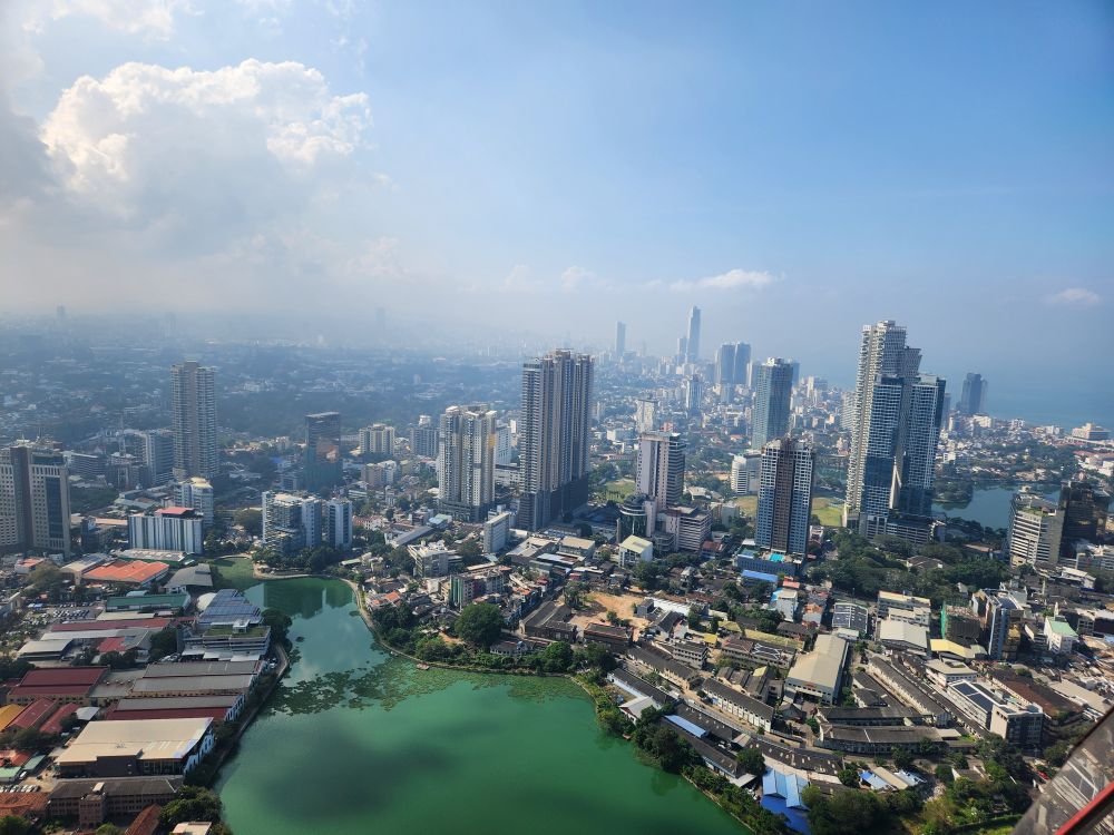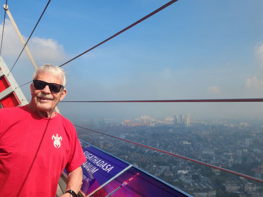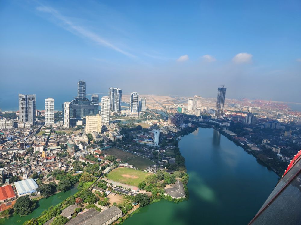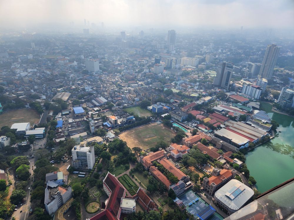 Then it is up in the elevator to the top, 1150 feet in the air, with a wonderful 360 degree view of Colombo. Although it is a bit hazy (or maybe smoggy?) out in the distance, the city views are not to be missed. You can really see all the new high rises – as well as the original 3 (see the picture with the 3 tan buildings circled). You can also see out to the reclaimed land that the Chinese are developing into a huge new Port City. There are multiple playing fields – where schools are having their year-end ceremonies – and the rather large Beira Lake in the middle of the city, plus we can spot the Hindu temple we just left.