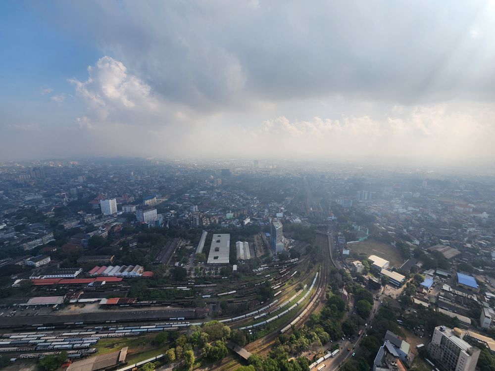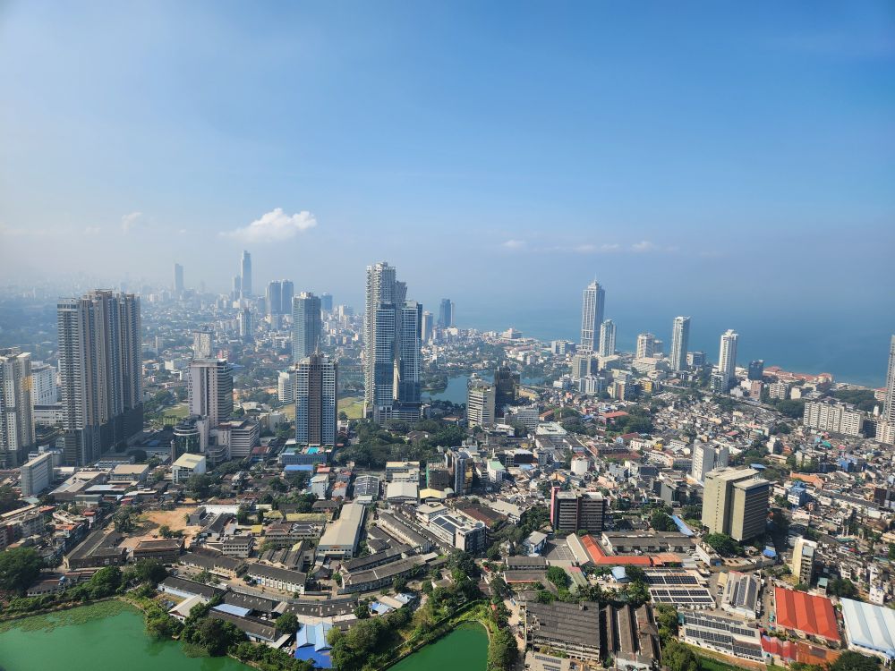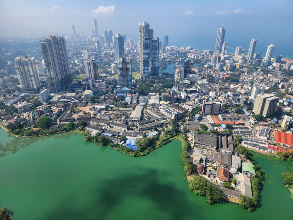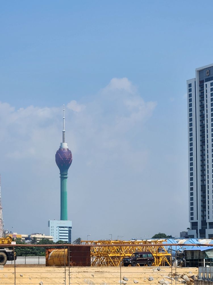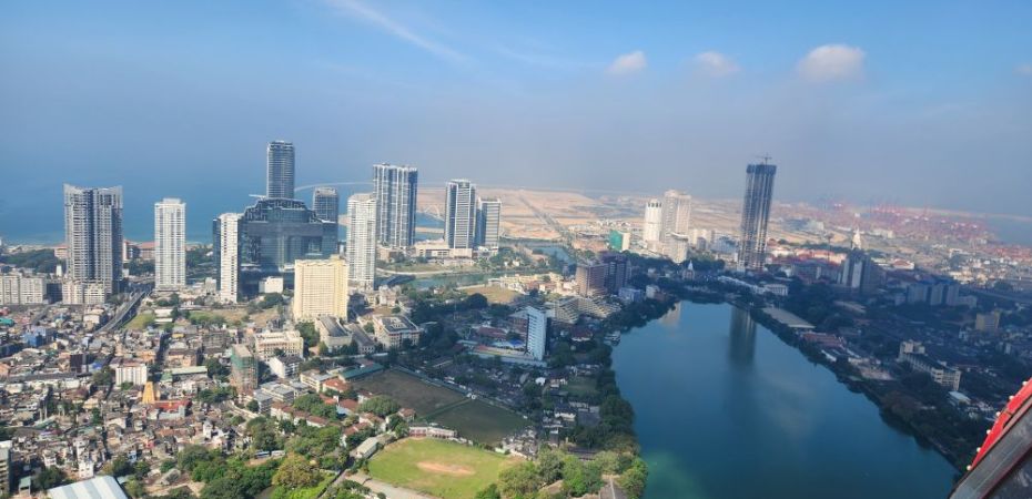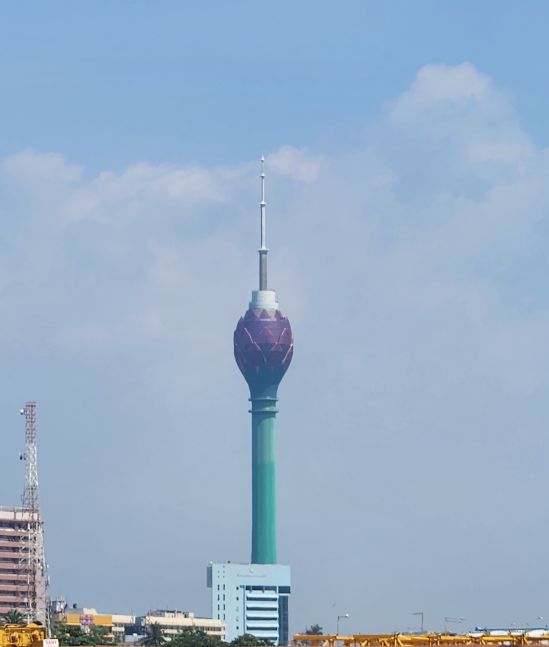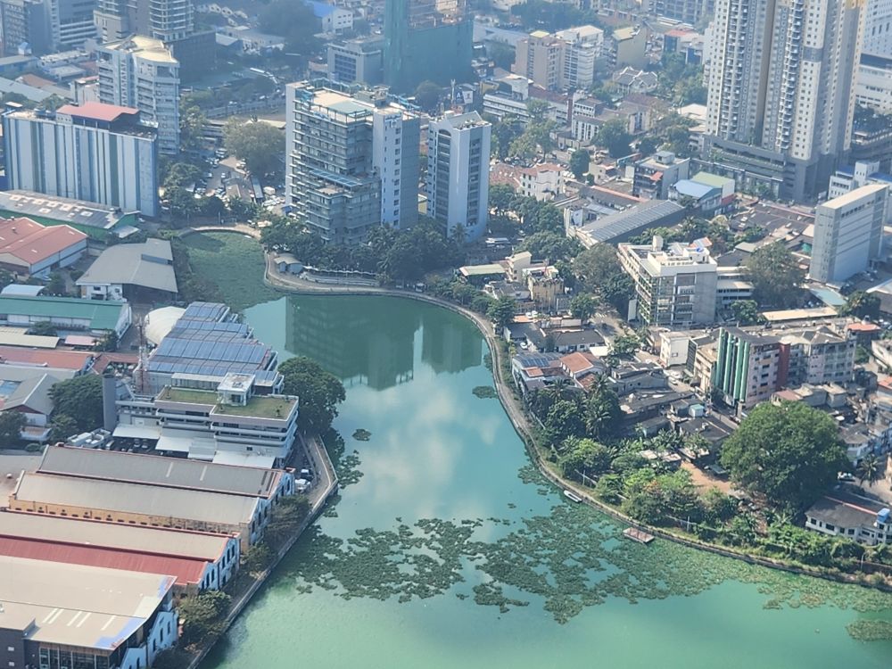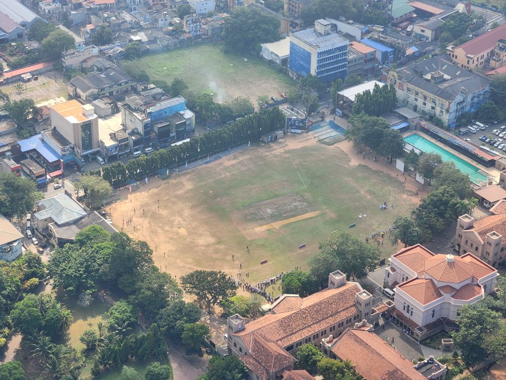 Then it is up in the elevator to the top, 1150 feet in the air, with a wonderful 360 degree view of Colombo. Although it is a bit hazy (or maybe smoggy?) out in the distance, the city views are not to be missed. You can really see all the new high rises – as well as the original 3 (see the picture with the 3 tan buildings circled). You can also see out to the reclaimed land that the Chinese are developing into a huge new Port City. There are multiple playing fields – where schools are having their year-end ceremonies – and the rather large Beira Lake in the middle of the city, plus we can spot the Hindu temple we just left.