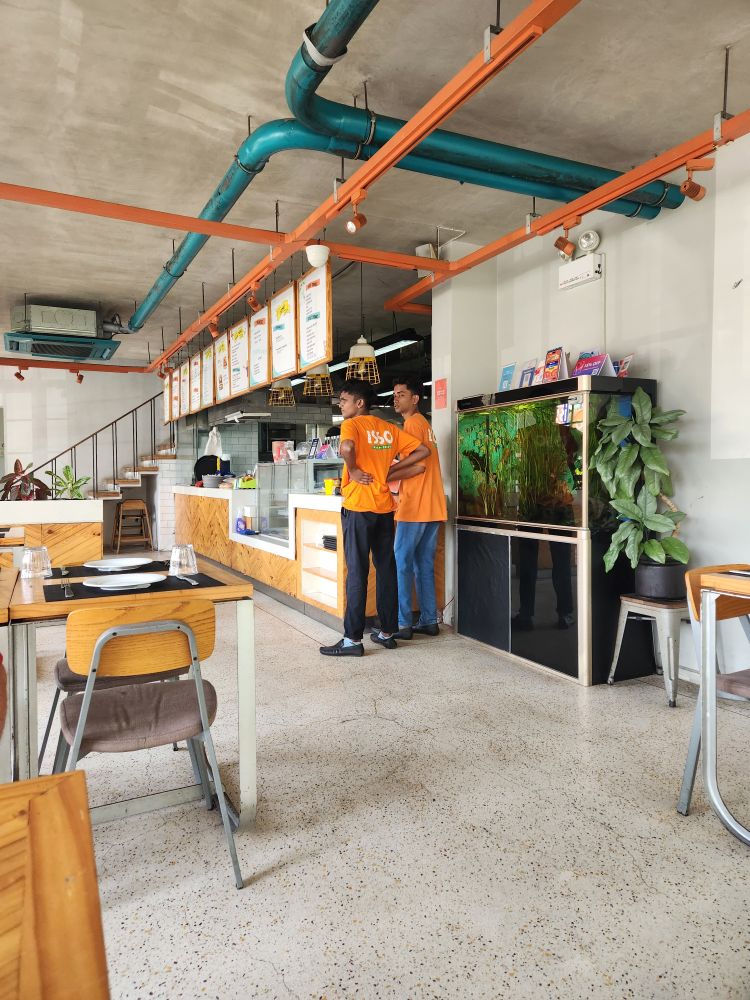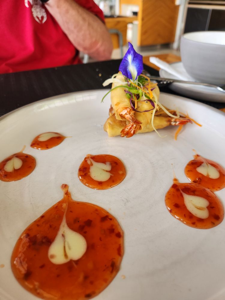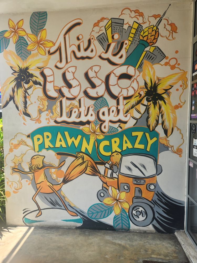 Meeting Shifan in the parking lot, we made our way back out into the city, passing the art wall where artists display their wares, and onto lunch. We had told Shifan we wanted seafood and we just happened to be right by Isso Prawn Crazy, a little local restaurant specializing, in yes, prawns. The menu is massive – with a history of the business explaining they started as a small business run out of a partially converted residential home, growing into a chain of 5 locations focused on community and local sustainability. Perfect for us. We start off with Corn and Crab meat soup for Ed, then continue on with prawn spring rolls (and because it is Valentine’s Day, get the sauce in little heart swirls on the plate), then move on to share Teriyaki Drift shrimp with garlic rice. Ed has a side of Watermelon juice – which is really good – and we dive into an excellent meal.