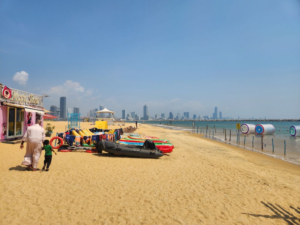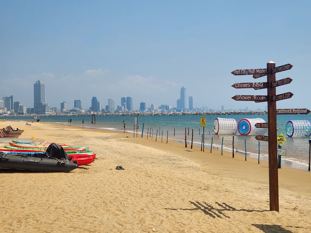 Then we are off to the new Port City, passing by the replica of the Aukana Buddha statue (which looks like it is flipping you off, but really it is the Buddha’s index finger pointing up in the Abhaya mudra, or reassurance pose) in a park across from the Government building. Shifan drives us through the Port city area – as mentioned owned by the Chinese – which has been going on forever. He says it has been 5 years they have been waiting for permits to build, because inspectors are checking for sinking. The space is enormous, as we saw from up in the Lotus Tower. Once complete it will be a huge residential and commercial complex, but for now, it is this massive expanse of empty land with a manmade beach (the only safe place to swim) next to a large Food Court. We walk around the Food Court, Shifan explaining that at night it is teeming with people (also explaining that they aren’t exactly 100% sure how “clean” the food is here, so they don’t bring visitors to eat here – thank you Shifan!) and on weekends the beach is packed with locals.