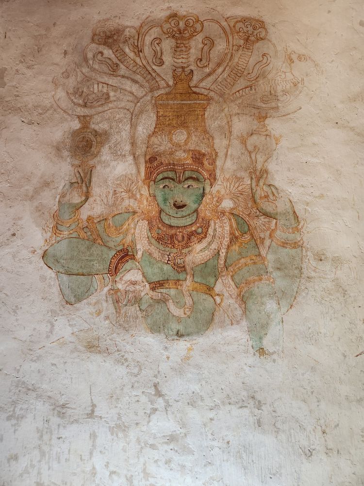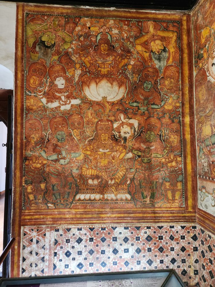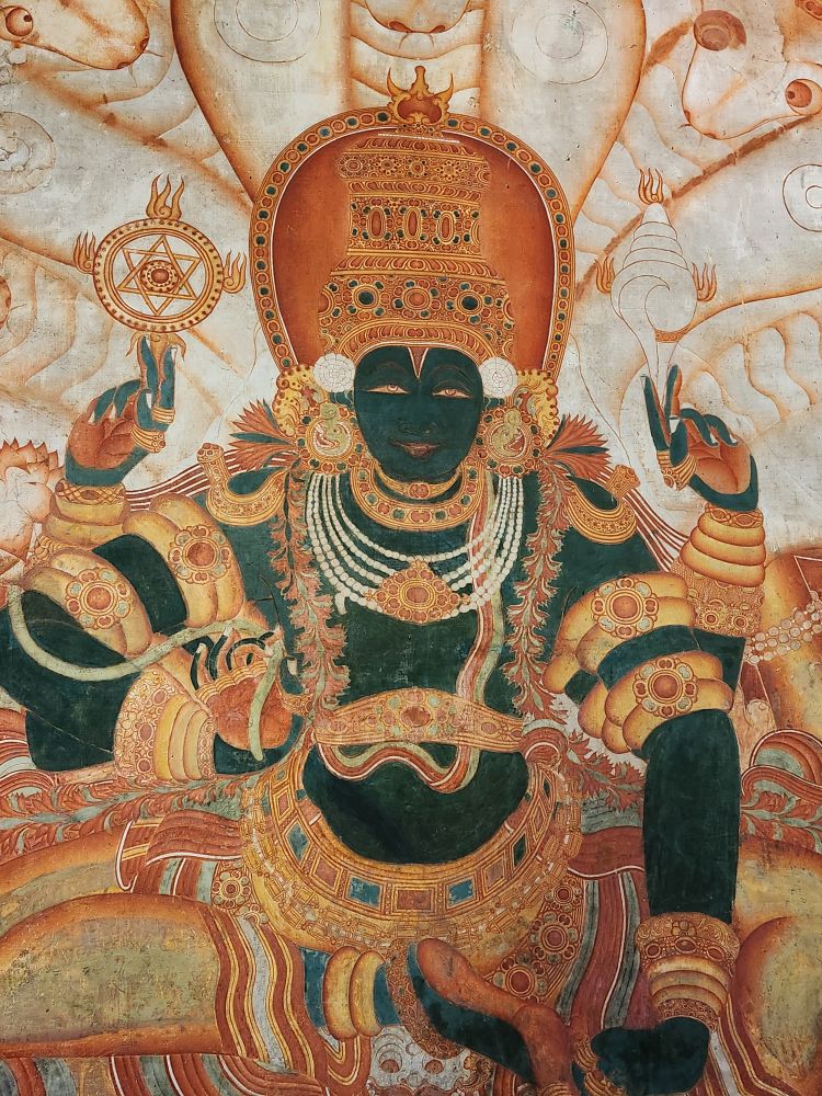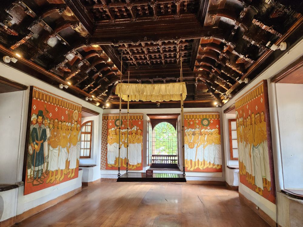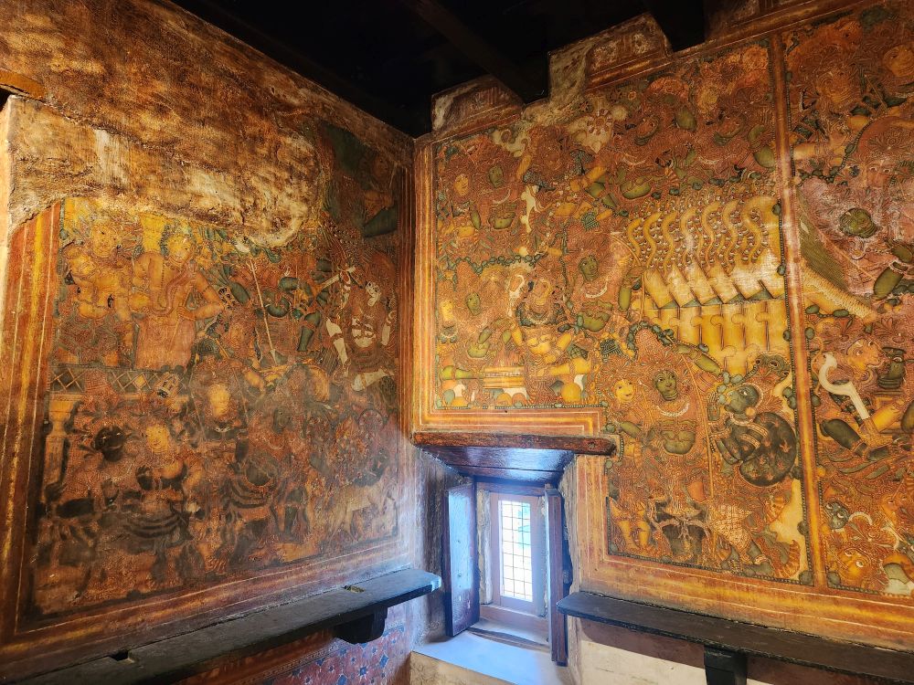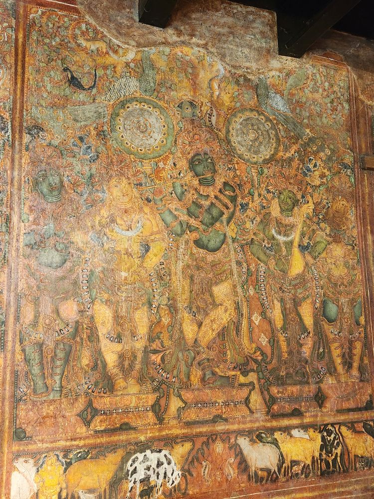 More rooms with murals – including the seated Vishnu, called Thripunithura Appan here in Kerala – as well as Anantashavyi Vishnu and Ganadharva Moksha, a tale about two Gandharvas who didn’t acknowledge a powerful god and were then cursed to live as twisted intertwined trees. The final room held a hanging table surrounded by more current murals.