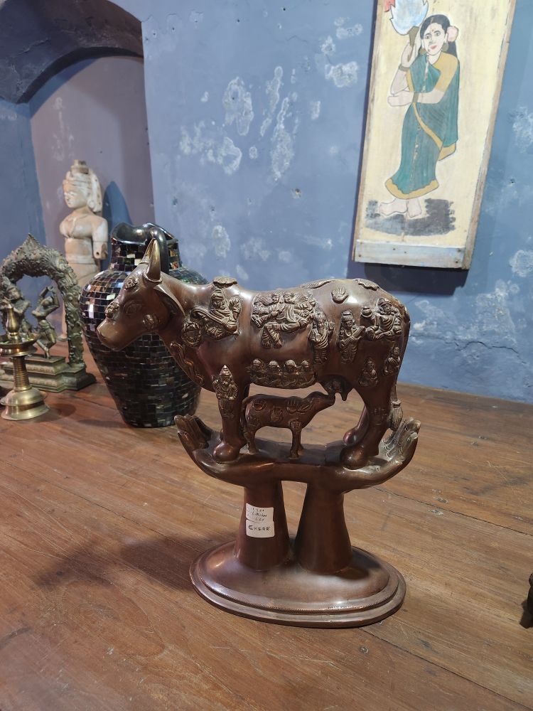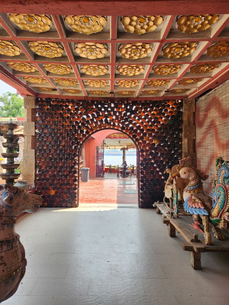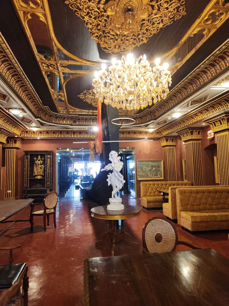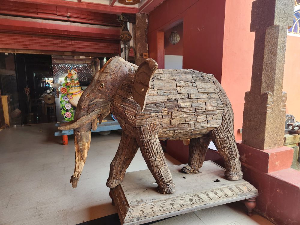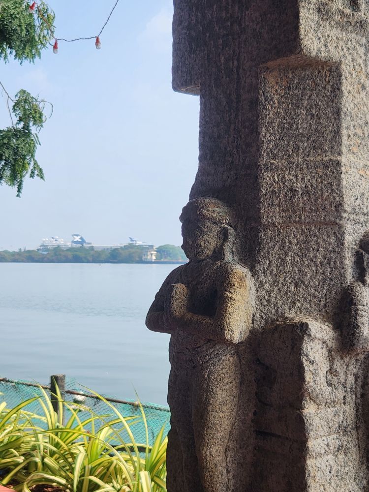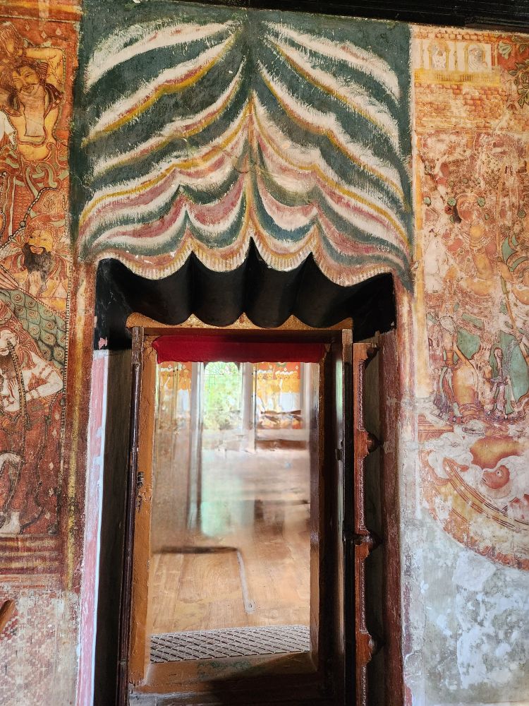 More rooms with murals – including the seated Vishnu, called Thripunithura Appan here in Kerala – as well as Anantashavyi Vishnu and Ganadharva Moksha, a tale about two Gandharvas who didn’t acknowledge a powerful god and were then cursed to live as twisted intertwined trees. The final room held a hanging table surrounded by more current murals.