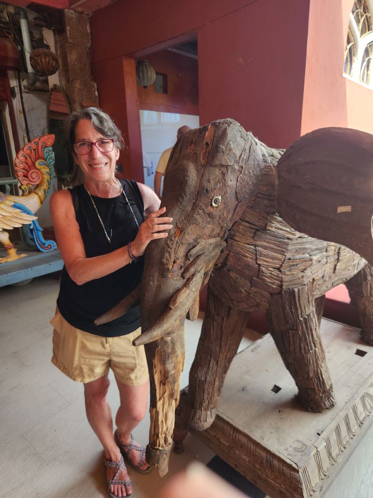 A great visit with loads of history for us – which of course we love. Now it is time for lunch – so out into the melee of streets around the Palace leading to Jewtown we go. Surprisingly, the shop owners aren’t quite as aggressive as others we’ve encountered, making the walk much more pleasant – although crowded with tourists and tuk tuks beeping at us to stay out of their way. We actually find a great pair of pants for Ed for far less than the port vendors were selling. And in the process meet a lovely shop owner who we chatted with for a while before heading out to find lunch. As it turns out, we ended up at the Ginger House Hotel – this was on our list but not one of our top choices as some of the reviews were a bit negative – pricey, slow, etc. For us? It ended up being a great choice. We walked through their fabulous “museum” of antiques then entered the open air restaurant grabbing a lovely table right on the water.