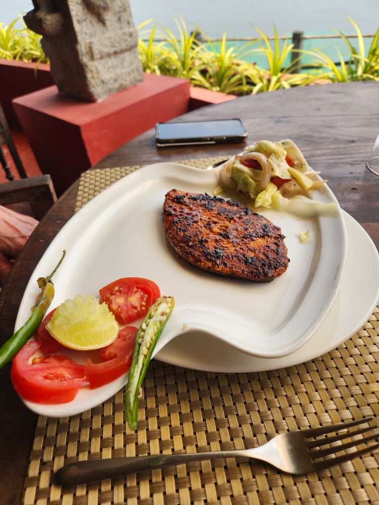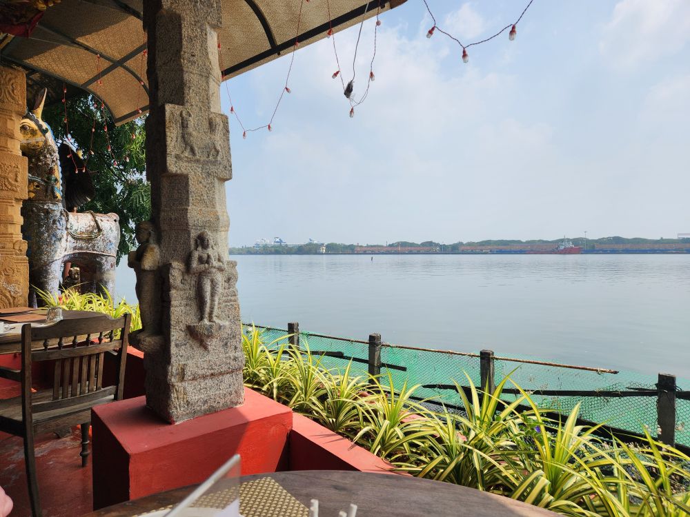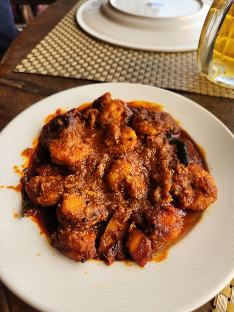 There were only a few others there – it was early – so it was nice and peaceful as we ordered our shared Kingfisher beer (wine is FAR too expensive to order in this country) that went along perfectly (so we were told by our waitress) with the traditional Kerala starter of “roast Prawns”. She was so right! The prawns were roasted, but with a slightly spicy sauce that was calmed down wonderfully when paired with a sip of Kingfisher. Our main plate was Tawa Fry – a local way to fry fish – which was wonderfully spiced and tender and perfectly done. We finished off with Parotta, a local bread, and another bottle of beer for a perfect chaser.
