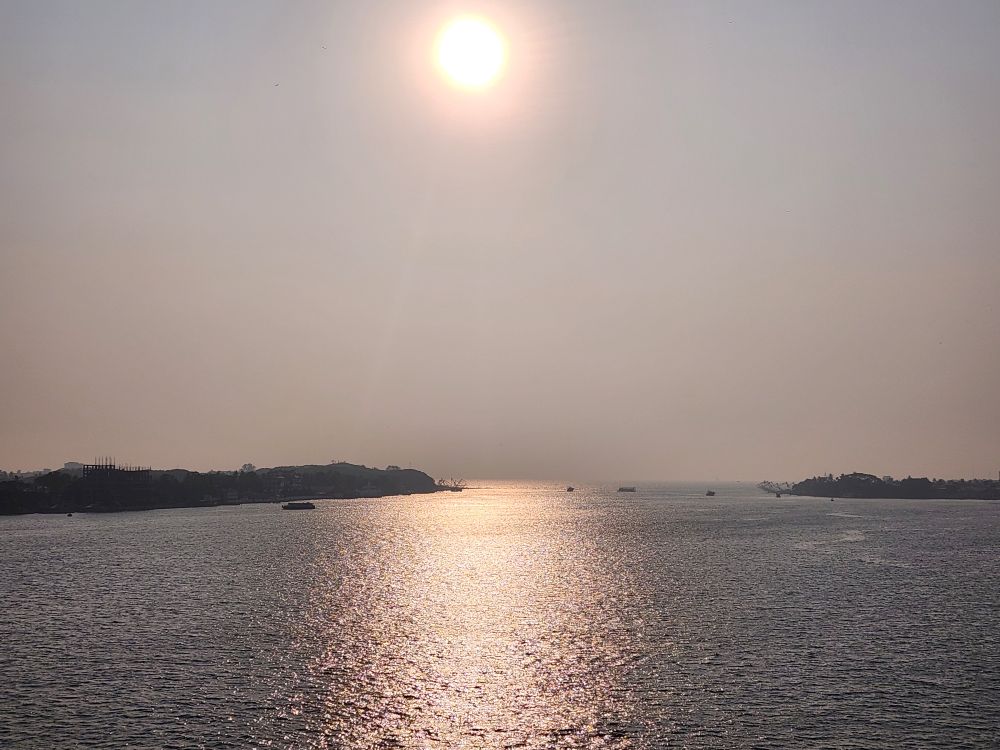 Back on board we have plenty of time before sail away – where Suriya has sweetly invited us to join her on the bow! So nice of her. We head down at the appointed hour, only for dummy me to forget I needed close toed shoes. Jeez-o-flip! You’d think I’ve never done this before. Well, okie dokie – here we go: I ran all the way back to the cabin (remember I am at the absolute front of the ship, running all the way to the absolute back of the ship) to change shoes and return. Phew! At least I proved I can still jog! After that excitement (or aggravation), all else went well and we spent a great hour out on the helipad watching Cochin, the Chinese fishing nets and the old colony buildings slide by into the sunset.