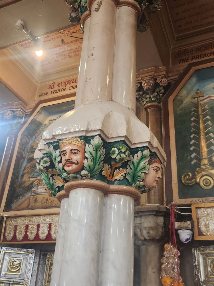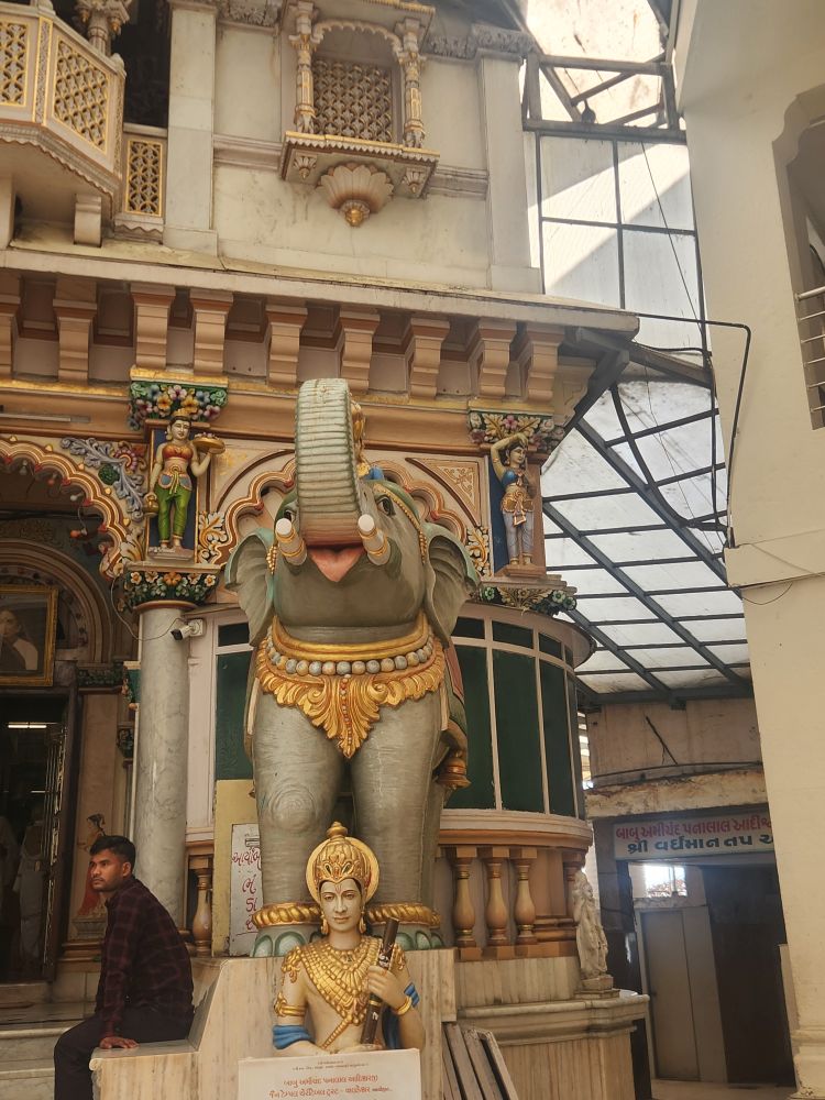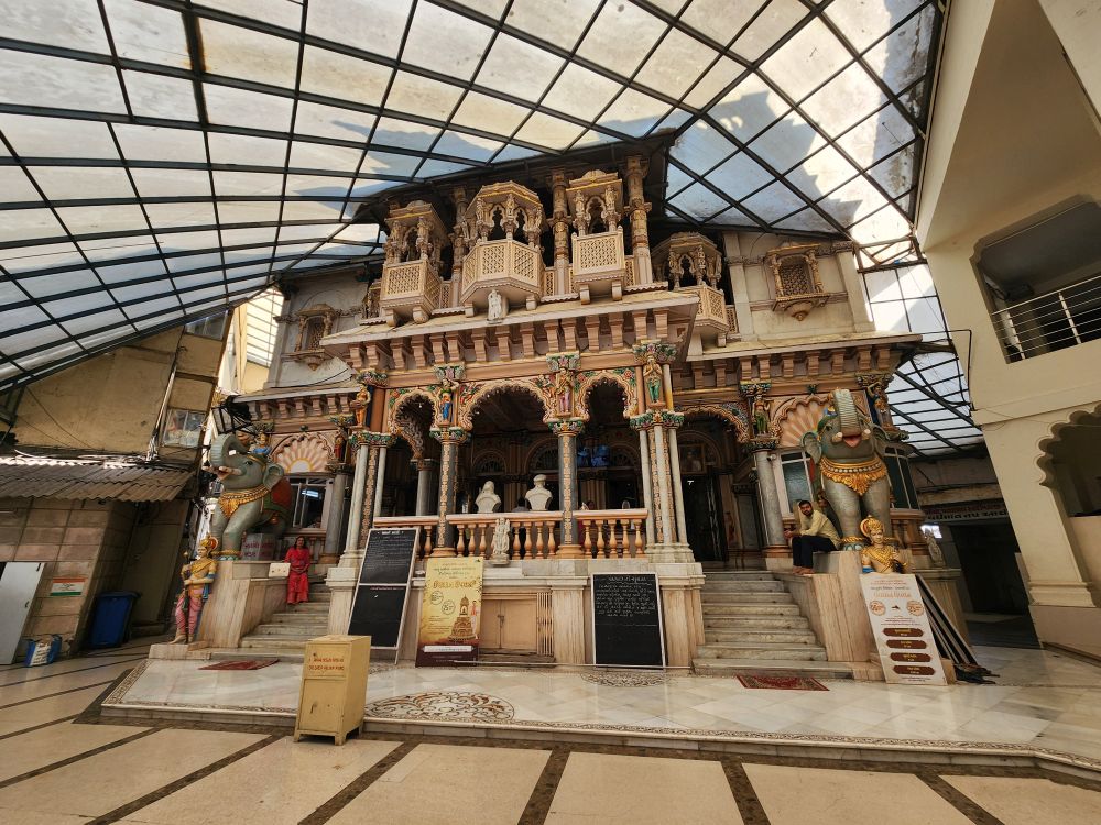 We explored the second story photo gallery, marveling at all the different things Gandhi accomplished and people he met, then onto the ground floor library, jam packed with more than 50,000 books all dealing with Gandhi and “Gandhian Thought.” And then we are out, before the next influx of tour people, and back in the car heading to the Babu Amichand Panalal Adishwarji Shwetambar Jain Temple, the largest Jain temple in Mumbai. Jain is an ancient Indian religion that, as opposed to Buddhism, does not believe in rebirth, but in achieving an all-knowing state called “moksha.”. Their temples are traditionally intricately designed and decorated ornately – which is definitely on display in this 120-year-old temple.