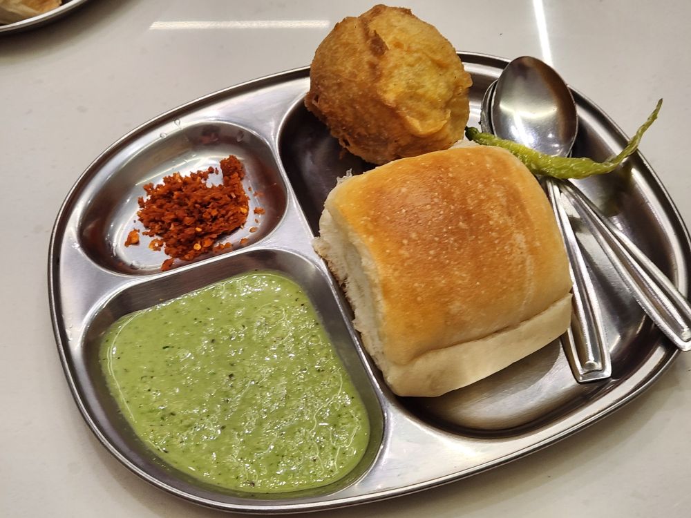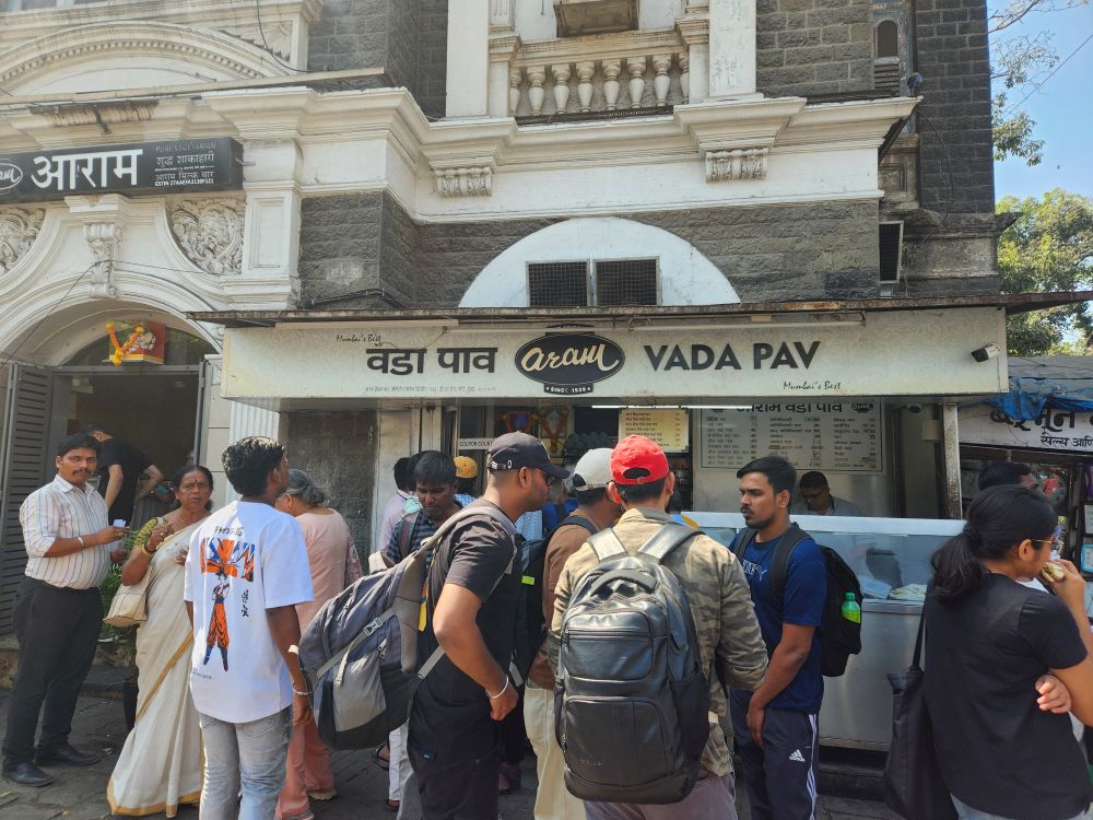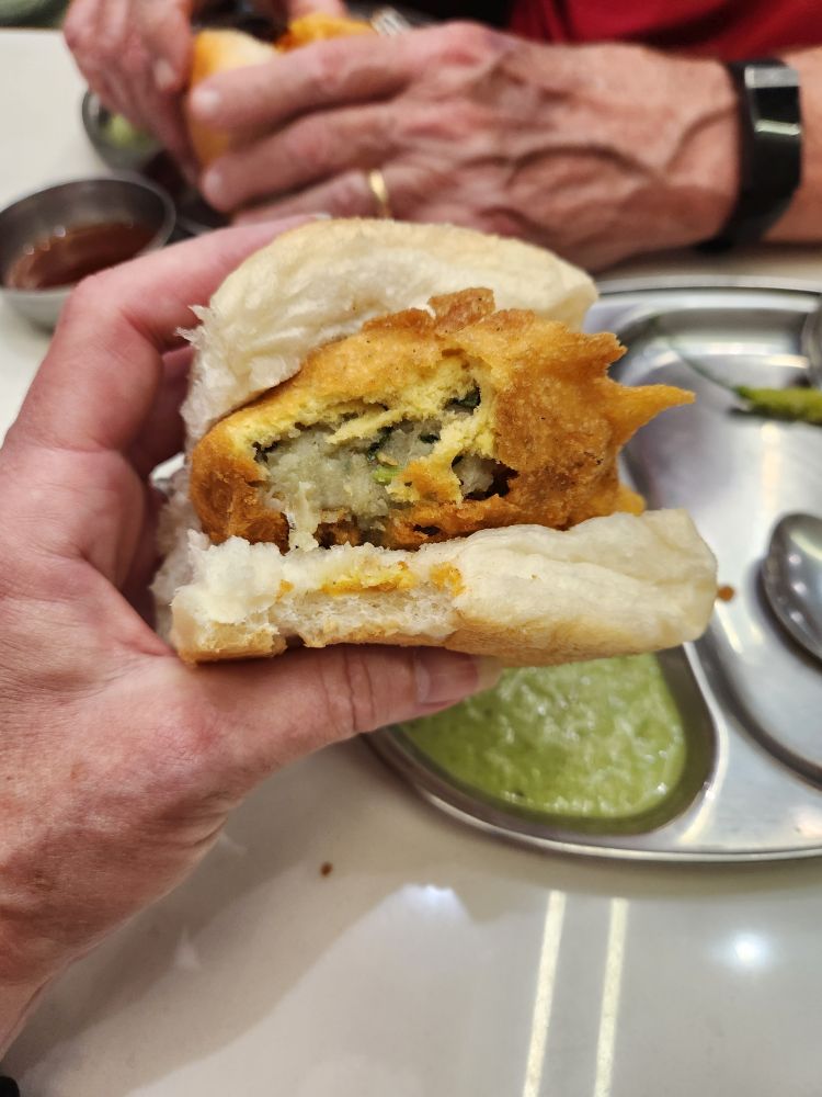 Next, we are heading to the ferry for Elephanta Island, but first we tell Husain we are hungry, just need some sort of snack to keep us going the rest of the day. He has the perfect place, which is right across from the train station: Aram Vada Pav – the most famous place for Vada Pav, the typical Maharashtra street food snack made up of a deep fried potato dumpling or fritter really, sandwiched between a fluffy bun. We manage to snag a table in the corner of the small restaurant (which also does a huge take away business from the open fronted window out front) and have Husain order us our meal. 2 Vada Pav, complete with chutneys, and 2 bottles of water. OMG – it was so good! And so huge!! We had a blast eating it, laughing and giggling and taking pictures of each other. Too fun. And get this, only 118 INR – that’s like $1.30 USD for all that food and 2 bottles of water!!! Crazy.