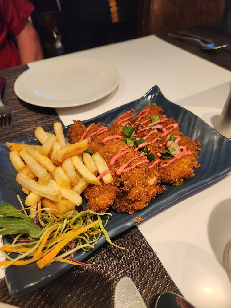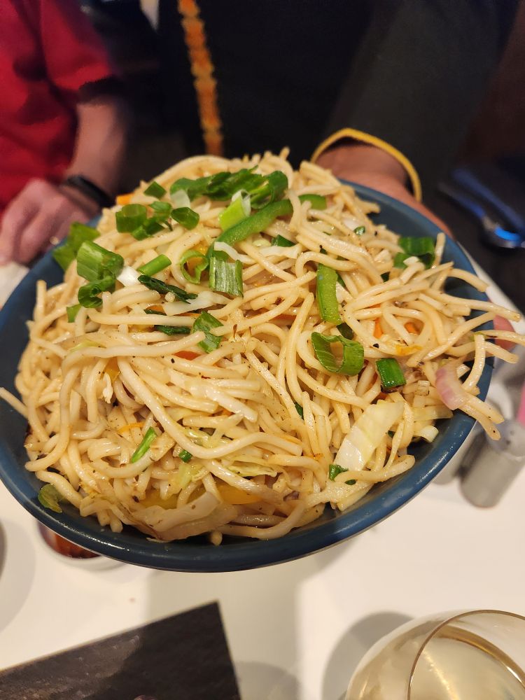 But we made it, and decided to take sanctuary in our sweet little hotel, eating in the restaurant again – because no way, no how are we going out into that melee! The manager was there again and gave me a huge wine pour – and then huge portions of food! More than we could eat actually. Ed had Chicken Katsu, and I had the same noodles, because they were so good. We started with a stuffed Kucha with cottage cheese which was excellent – but so filling. It was probably the reason we couldn’t finish the noodles!