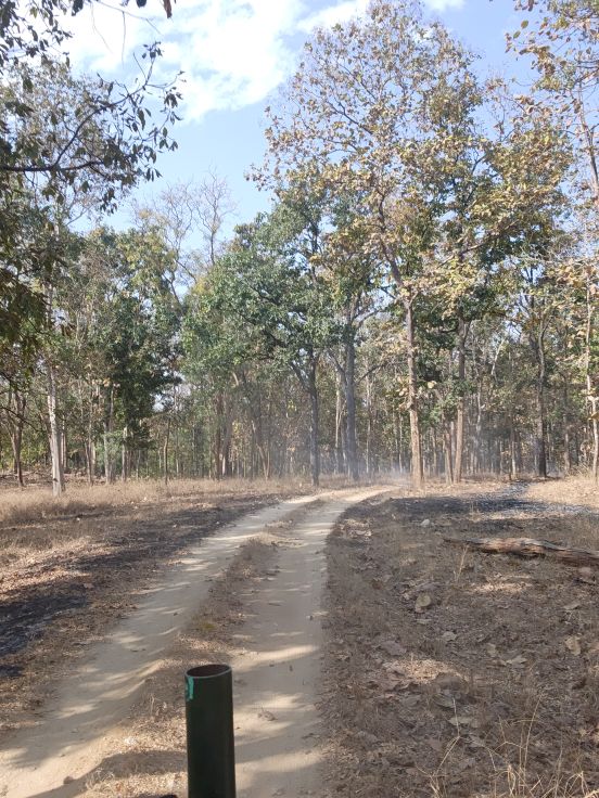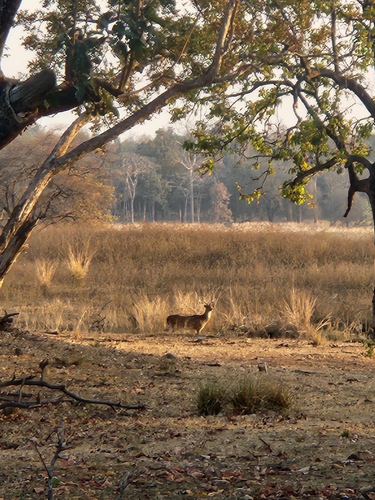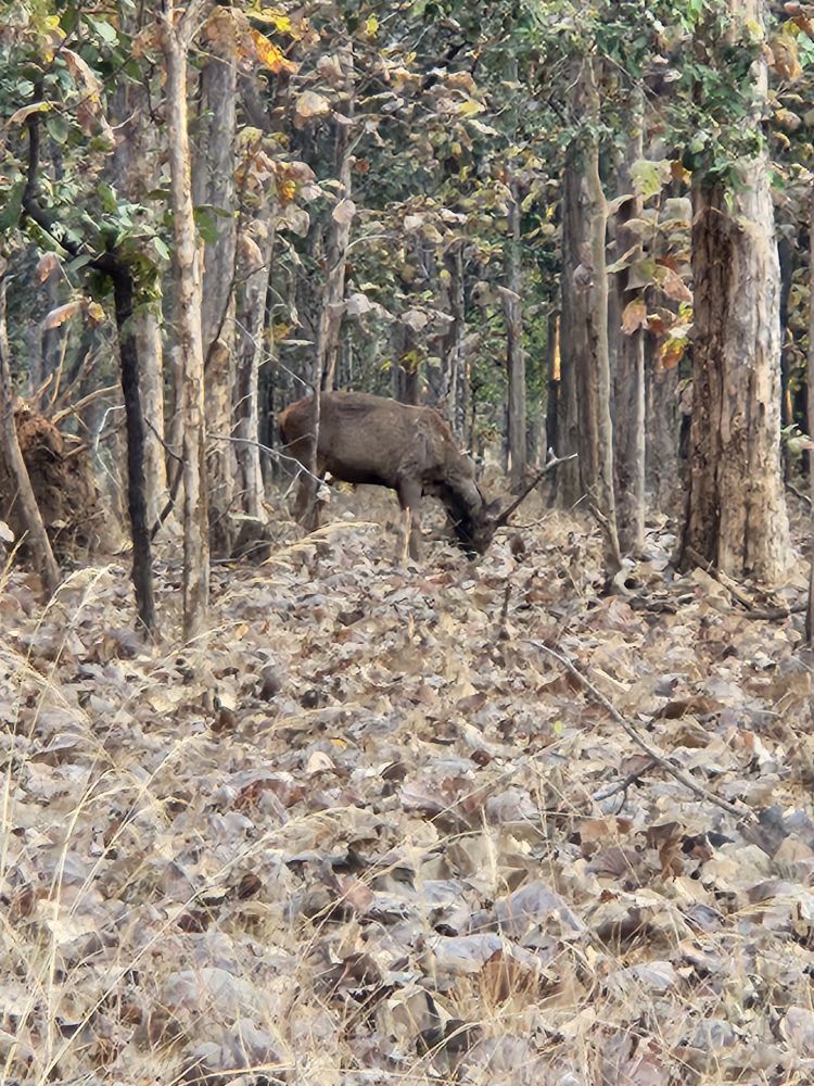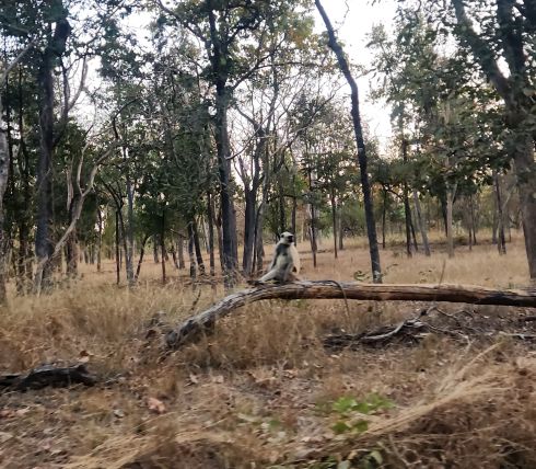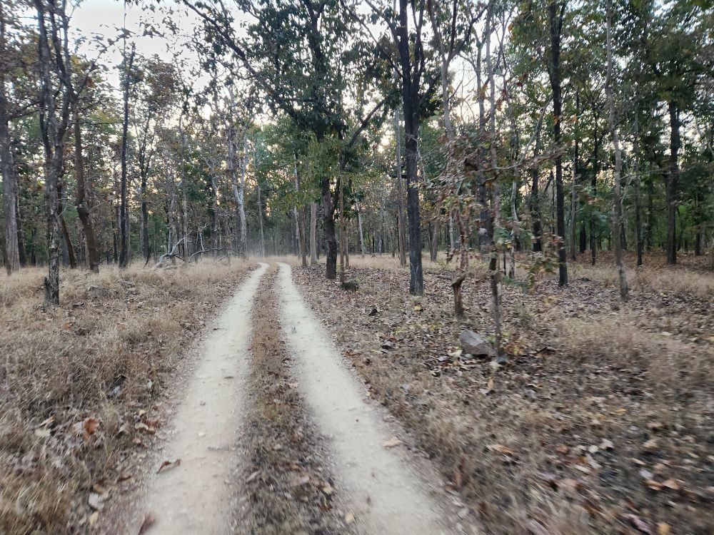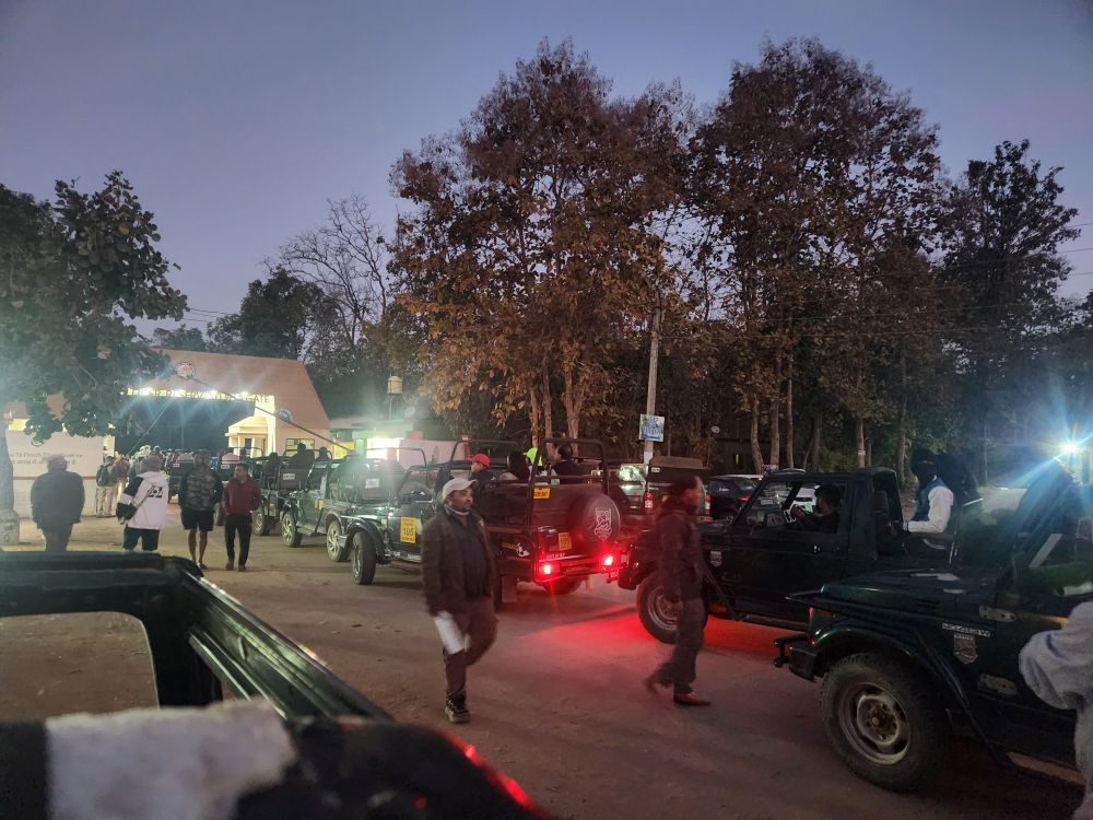 Our guy-guide-escort-driver puts us and the breakfast into our own jeep and rides out of the resort, passing the huge 30-person bus-like open air game safari that is loading other guests from the hotel. Private tour it is! Off to the National Forest gate we go along narrow dirt roads in the dark . Arriving at the gate, the jeeps and game drive vehicles are lined up almost back to the resort! Every Indian in Pench must be here! Our guy-guide-escort-driver says wait. Ok, wait we do. A few moments later, he returns, takes us to another jeep and we get in with 4 others – 2 younger Indian couples, one of which we end up splitting up because we are in the back seat with the guide and one of them has to sit in the front – and off we go.