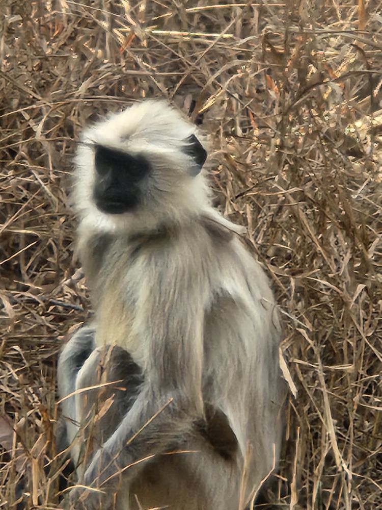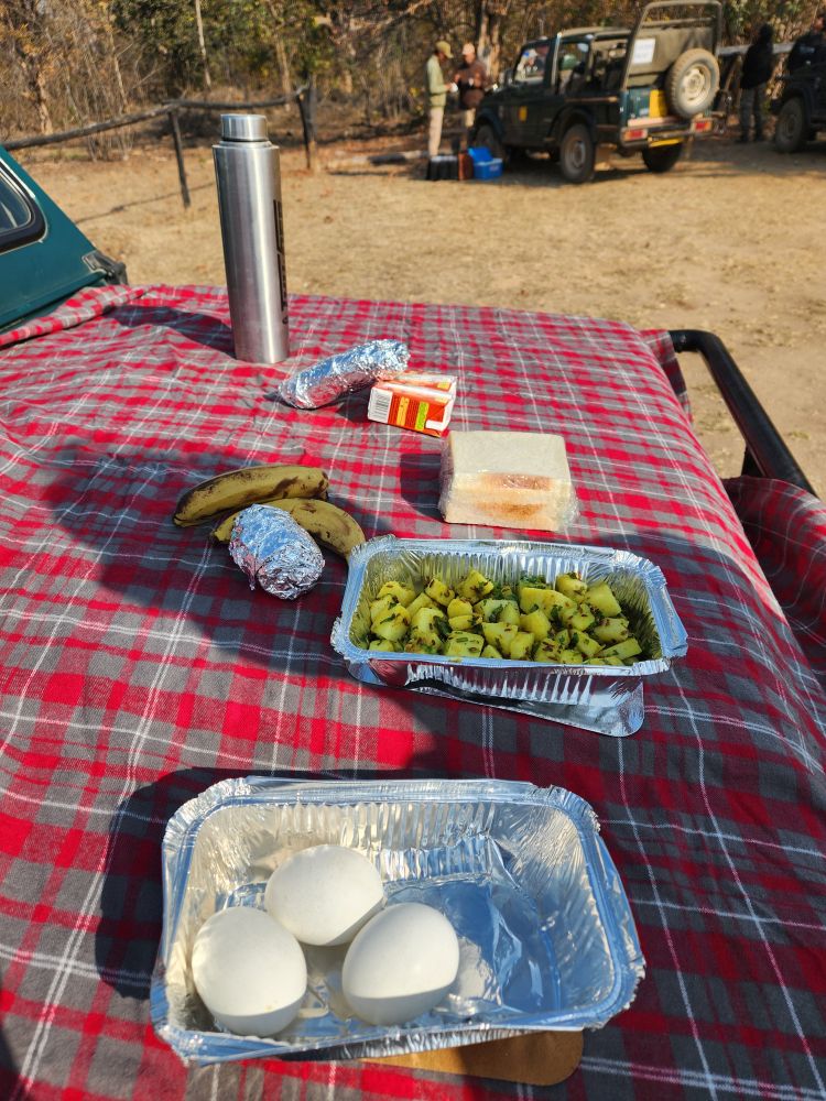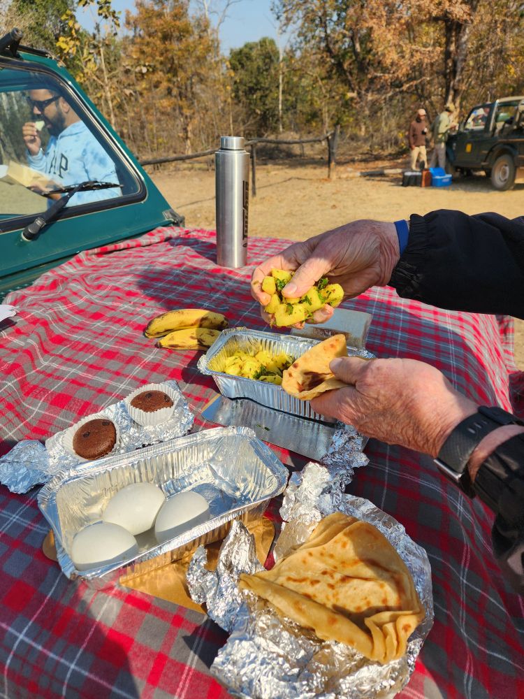 The guide does spot a tiger – but just his back and tail – way, way off in the distance (I never see it – Ed does – so I’m trusting his sighting skills!). But we did see a tree where the tiger scratches to sharpen its claws. Continuing deeper into the park, we spot lots more wildlife, as mentioned above, finally stopping for a late (as in 9:30) breakfast at a rest stop. This too reminds of Gate 1 – breakfast spread out on the hood of the car – but not. Same, same, but different! We eat our potatoes with our Naan bread and gulp down the bananas, then we are off again for the ride back to the Gate.