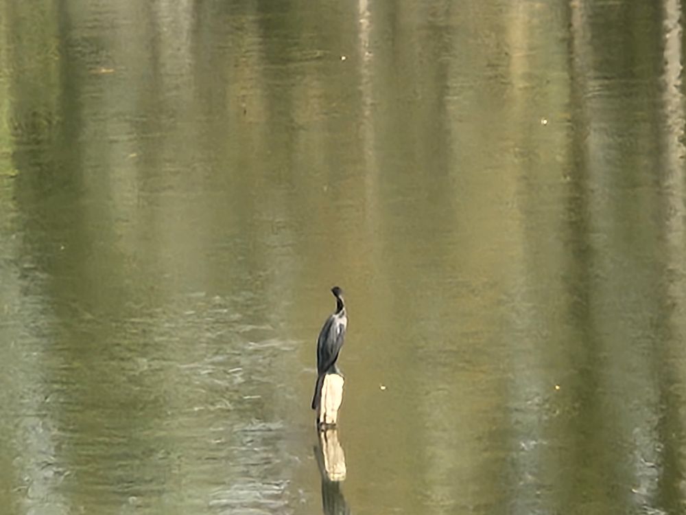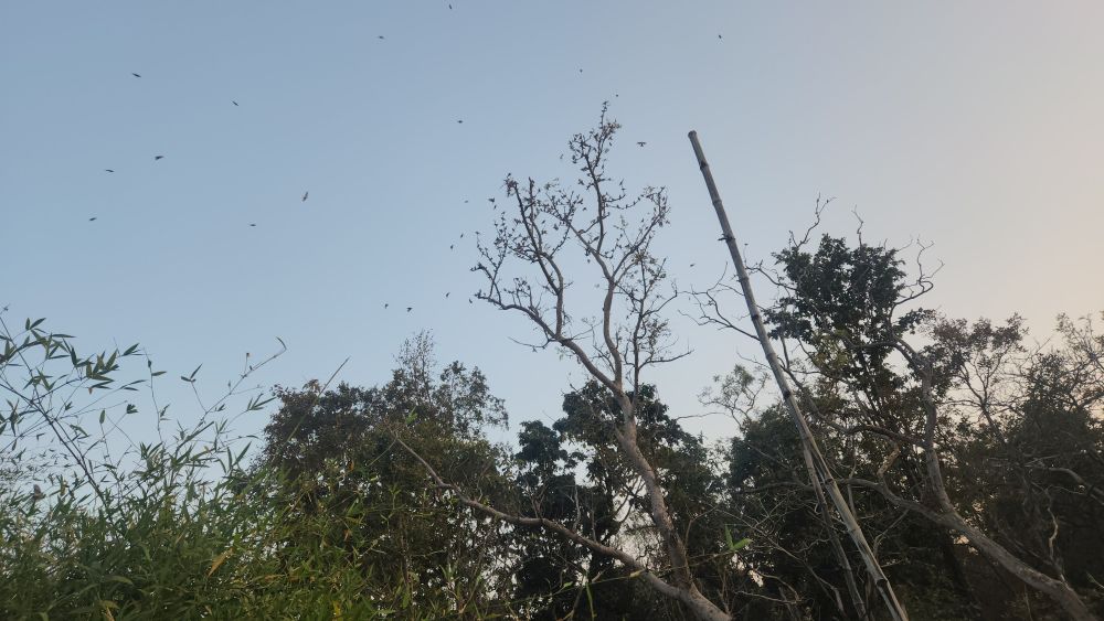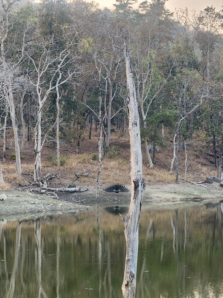 Excitement done for the day – the rest of the drive is nice, past neat rock formations, out to the big lake again, this time for a rest stop in a “rustic” outhouse (as in 3 walls and some rocks for the boys, a hole for the girls – pass!), then back to the gate, past more ponds, peacocks showing their plumage, deer, monkeys – plus this huge flock of birds flying all around these trees. We sat there forever just enthralled watching them.
