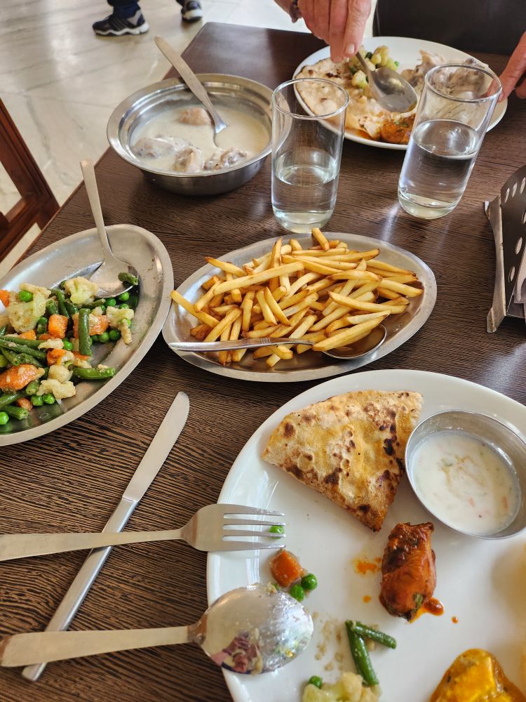 We’ve got about an hour to kill before lunch, so we hang out on our front porch area watching the wildlife in the trees behind the lodge. We didn’t know that we were supposed to leave our keys with the front desk when we left for room cleaning, so I went up and gave them the keys to clean now, thus, we are out of the room with nothing much to do until lunch. Eventually we just go to the dining room early and sit there, which works out great, because the manager sees us and comes over to talk for a long while. Really nice plus he has coffee brought to us as well, which is even better! The buffet eventually opens and we get a plate, but then they start bringing us food that they think we will like that isn’t spicy. They are so sweet! Vegetables and a creamy chicken dish that is excellent – oh, yeah, and the French fries! We are stuffed.