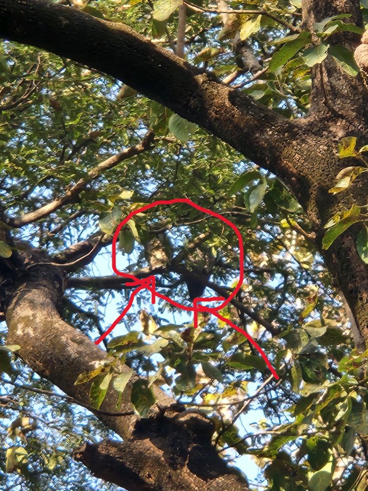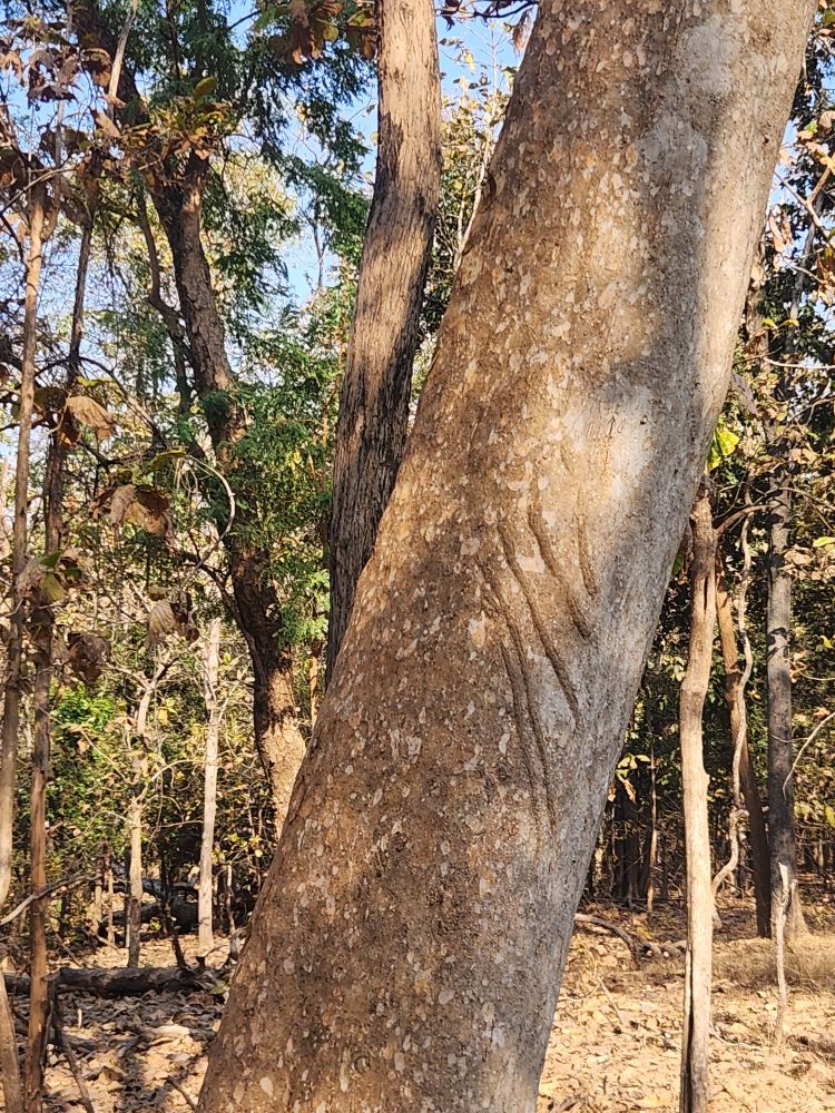 Off we go, down the same track as we did in the morning, all by ourselves, but turning off at some point to some different areas – we think. You get a little confused and turned around in here after a while! For the first few hours, we enjoy watching the same animals as in the morning: Monkeys, Deer, Peacocks, Owls (that you can barely see – I added an arrow to help!), oh, and a tree where we could see Tiger claw marks! Cool, that makes 2, and probably the closest we’ll come to seeing the Tiger!