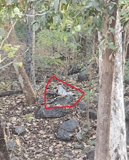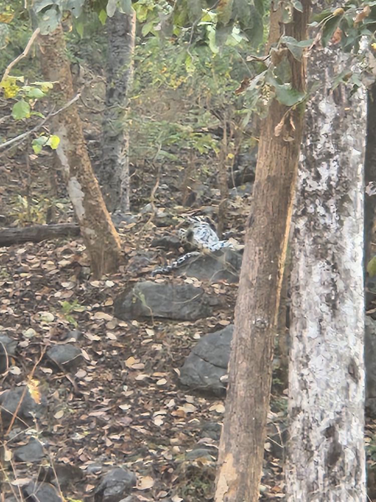 And then, wonders of all wonders, we see a leopard! Way out through the trees, sleeping on a rock. Totally cool and very rare – or at least that’s what the guide told us. Most of our photos aren’t that great – but you can sort of see him/her out there between the trees.