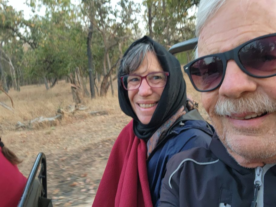 Our new morning normal – early wake up call, then wait in the lobby for someone to take us to the gate. Our normal guy-guide-escort-driver got us, took us to the gate and put us in the other jeep – this time with a couple from the Netherlands – well, he’s a biologist from Netherland, she’s French, but obviously living in Netherlands with him. We saw them yesterday on another jeep as we were wandering through the park. As we waited, another Indian couple comes up, looks at the jeep and the husband shakes his head. He won’t get in the jeep with us. We can see why – we have the back seat where the guide will sit with us. The biologist is 6ft 10in tall and his legs take up most of the front seat with his wife – so there is really only seat left. After some negotiation, the other couple leaves and it ends up just the 4 of us. Perfect!!!