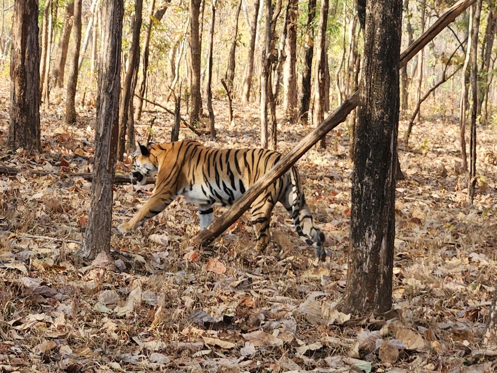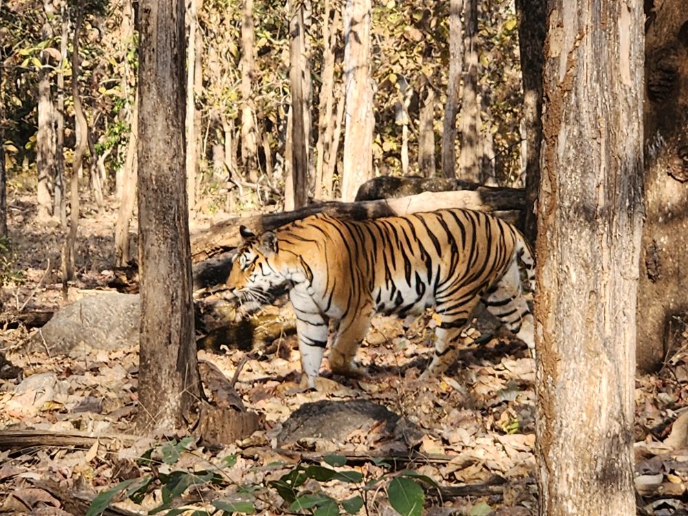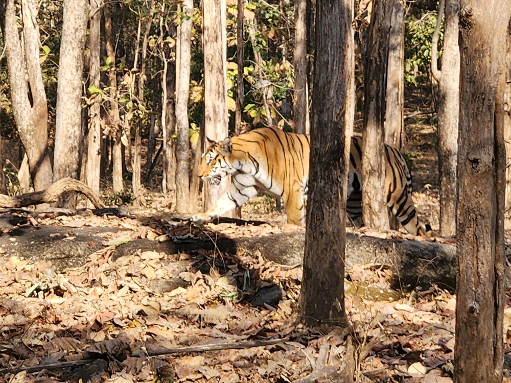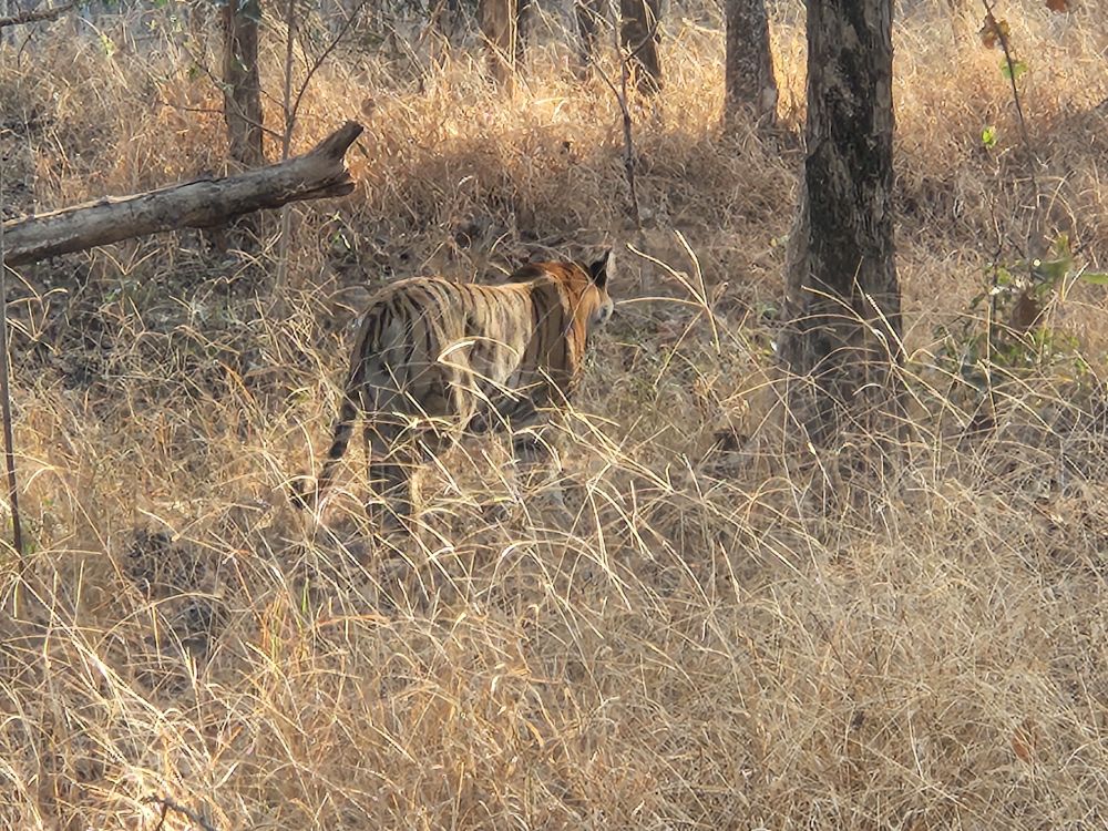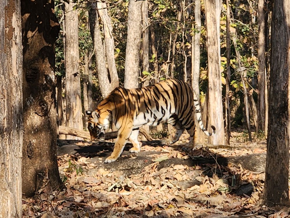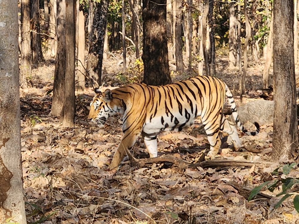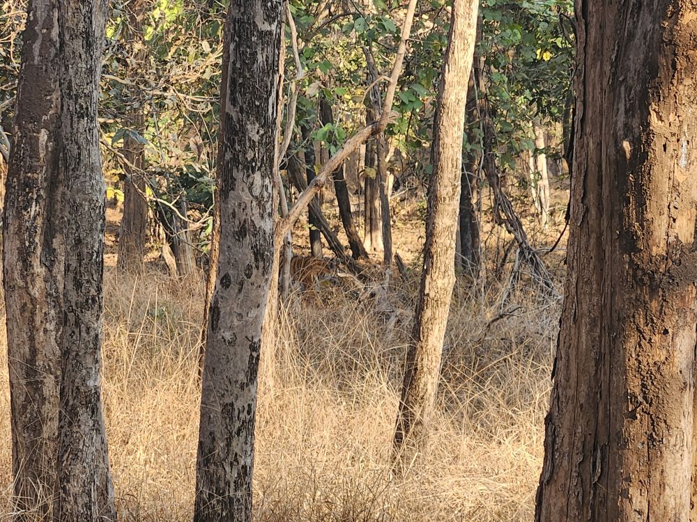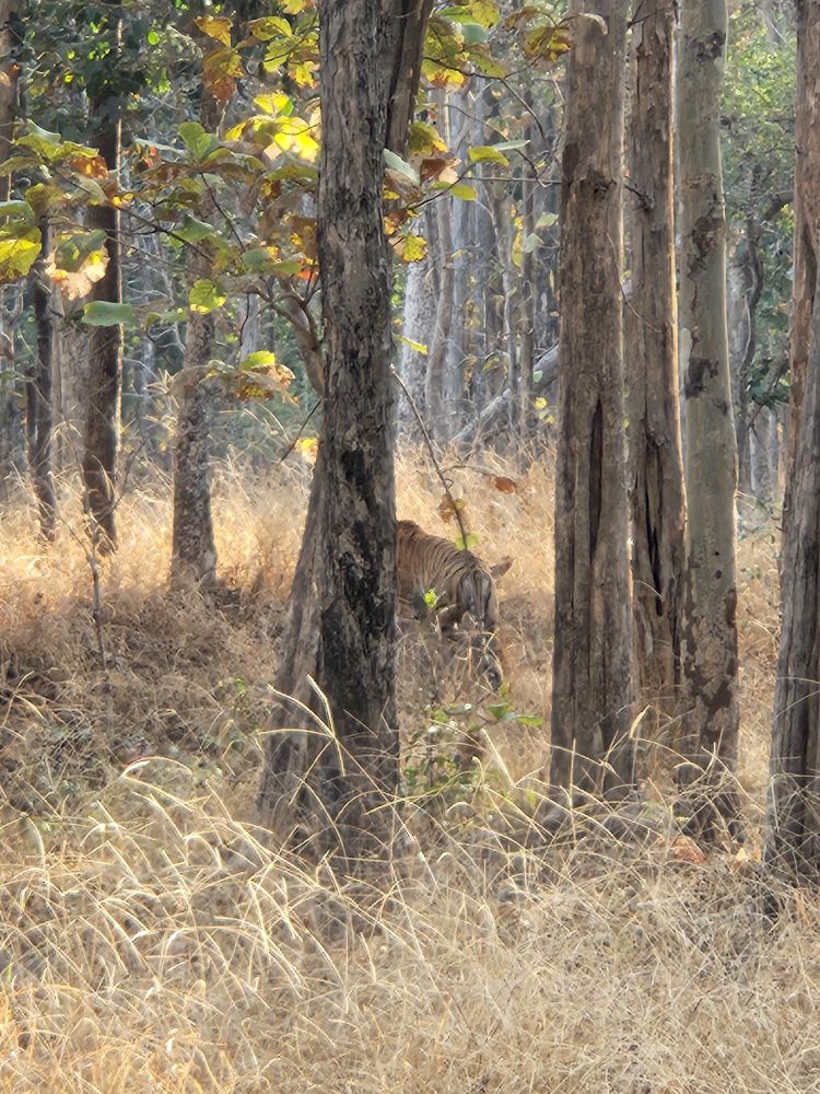 So off we go, into the forest, learning all about the animals we were seeing – the Vrubel deer, Gaur – the name for wild bison. We spotted a white-eyed budger (who knew?). Spied a Crocodile tree – so named because of its rough bark that did look just like crocodile skin. Learned that the ghost tree changes color 3x – white summer, pink winter, green spring. Learned that there are different tiger habitats on different tracks: Track 1 has 5 tigers, Track 2 has 15 and Track 3 (where we are today) has a small number. There is also 1 black leopard in park, but he/she lives in another section – so no hope we’ll see him/her today. All this from Flemming, who has researched the heck out of this park because he says it is the best place to see tigers – and from our experience today? He’s absolutely right!