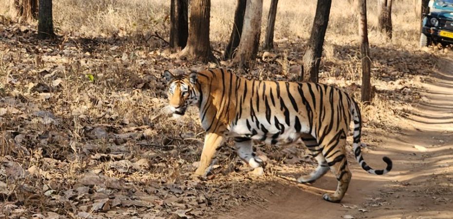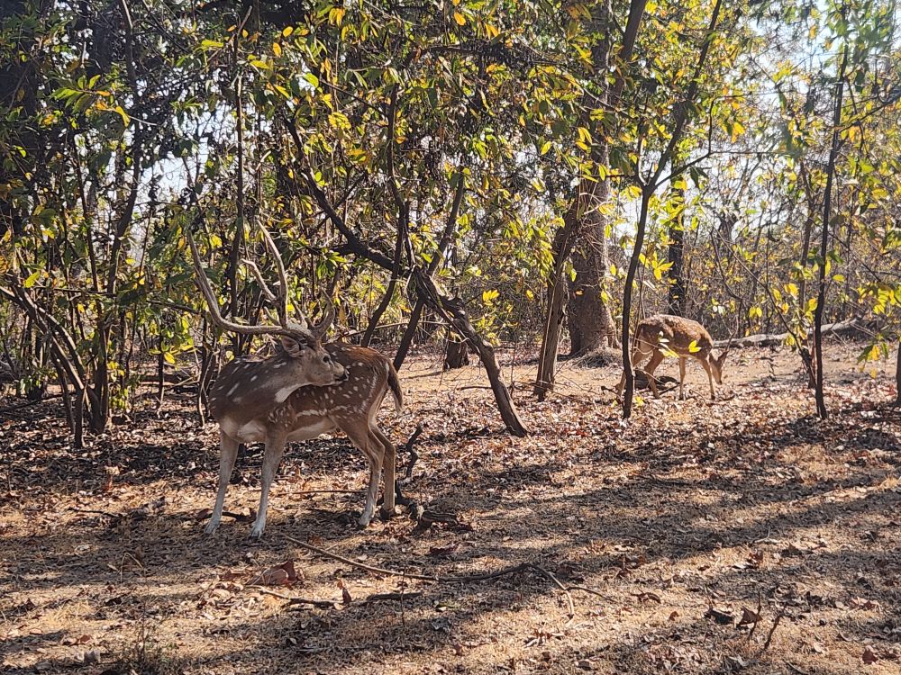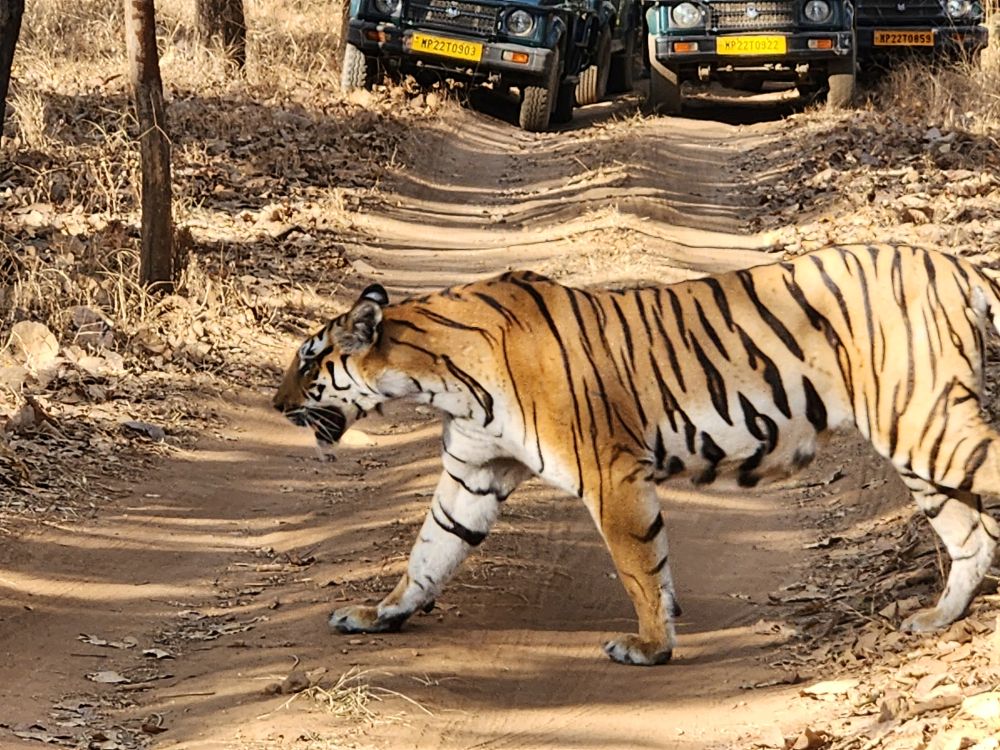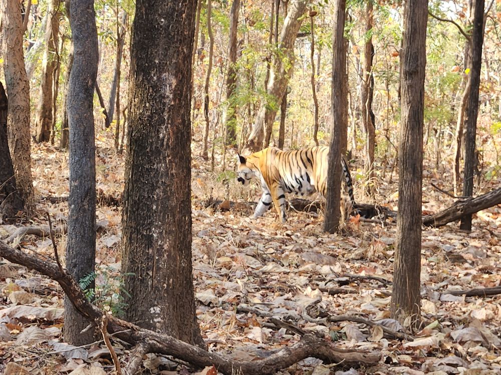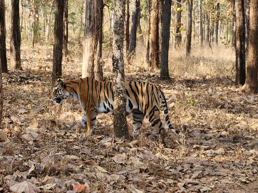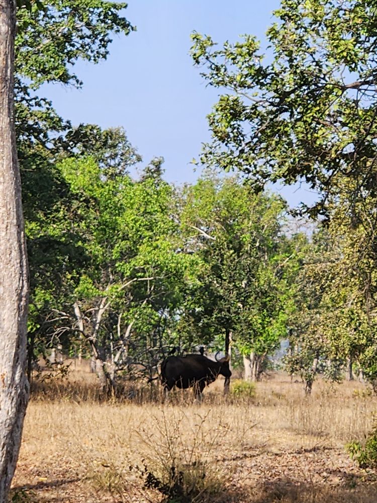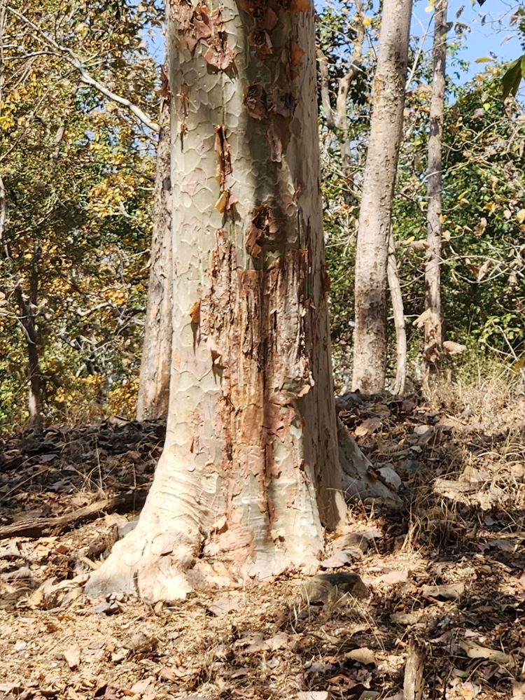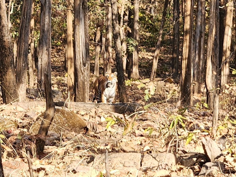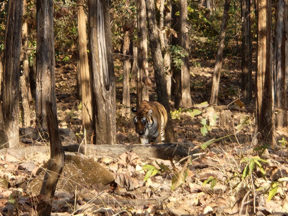 So off we go, into the forest, learning all about the animals we were seeing – the Vrubel deer, Gaur – the name for wild bison. We spotted a white-eyed budger (who knew?). Spied a Crocodile tree – so named because of its rough bark that did look just like crocodile skin. Learned that the ghost tree changes color 3x – white summer, pink winter, green spring. Learned that there are different tiger habitats on different tracks: Track 1 has 5 tigers, Track 2 has 15 and Track 3 (where we are today) has a small number. There is also 1 black leopard in park, but he/she lives in another section – so no hope we’ll see him/her today. All this from Flemming, who has researched the heck out of this park because he says it is the best place to see tigers – and from our experience today? He’s absolutely right!