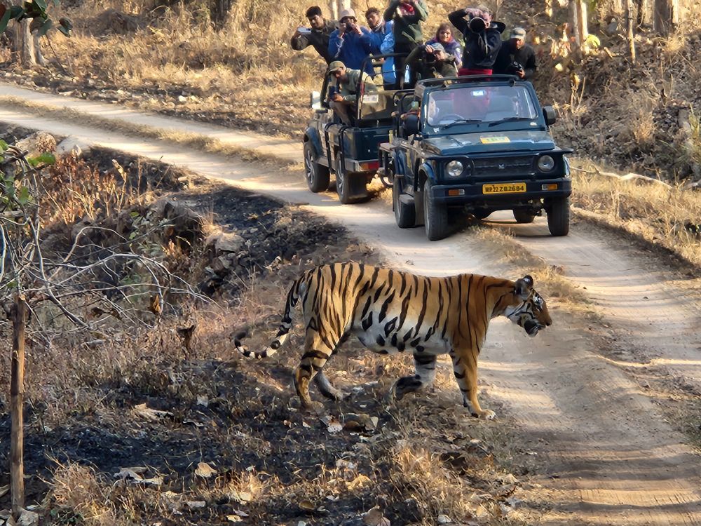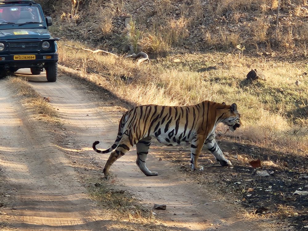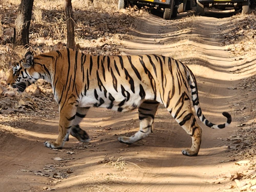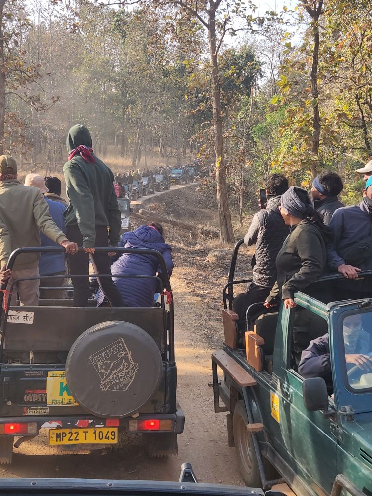 Once she was across, we tracked her through the forest and up on a ridge. Then all the jeeps started “following” her along the road – there were so many jeeps, it was hysterical. And we had been in the prime position! Now we had a blast watching the jeeps tracking the tiger, all lined up in a huge row. Of particular interest where the ones reversing down the track at top speed. Crazy.