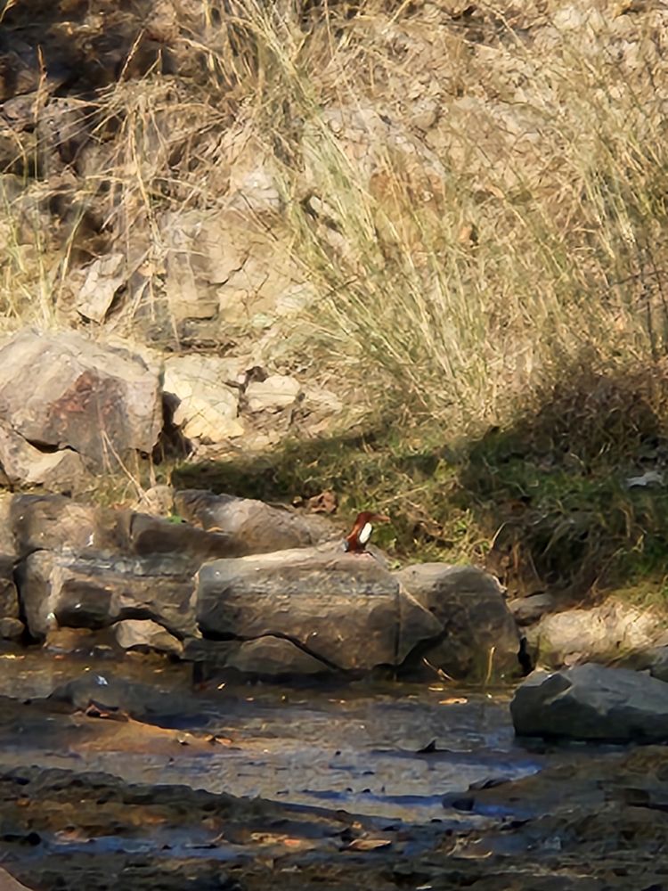 On we go, passing a monkey on the side of the track, then more ghost trees, more chital, another tree with tiger claw marks (crazy wild!), an owl (really hard to see), various birds that Flemming and wife know the name of, but we’ve forgotten by now (although he did tell us about this great app for birds and bird sounds). We talk about those weird water/rain sprinkles that have been falling on us on and off through every game drive. Nobody knows what they are, we figured Flemming the biologist would, but no, he hasn’t a clue. Nor does the guide. Ok, I’ve decided it’s monkey pee! And I’m going with that!