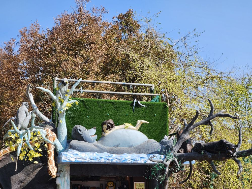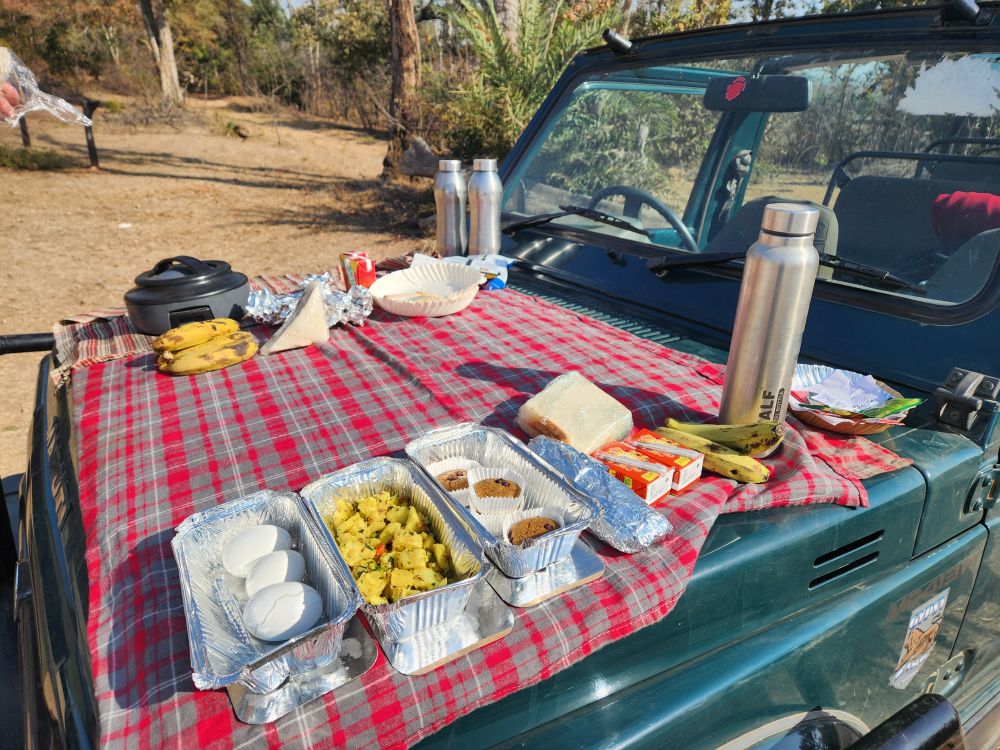 Stopping at the rest area for breakfast, we hit the bathrooms (lovely, seriously!) and snap pictures of the giftshop that is all about The Jungle Book and Mowgli and Baloo (so cute), then eat our breakfast atop the jeep just as we had the first day. Very fun – and still far too much food (although I do filch most of the muffins for a snack later)!