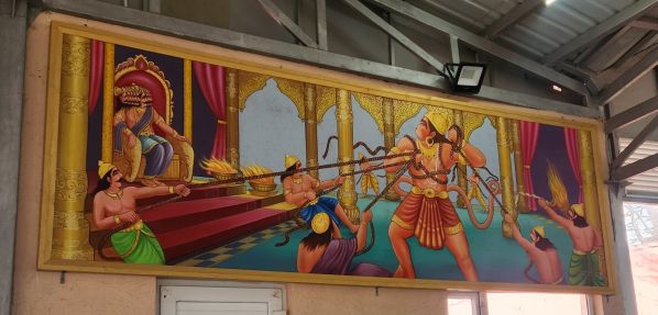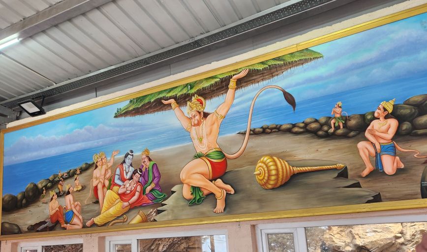 We wander through the grounds, visiting the small temple at the top of the hill, stopping for more photos of Hanuman and the scenery as we depart and enjoying the murals of Hanuman and Ramayana on the walls of the elevator building as we descend.