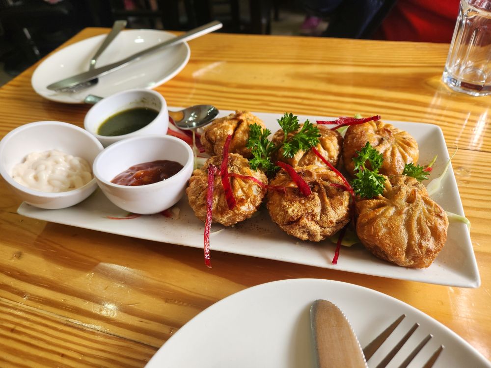 Back down at the parking lot, our driver is there waiting and we descend further on the windy, narrow little lanes that lead us back down to Shimla proper. Here we are visiting Mall Road – the main commercial area of the town. Our driver lets us off at the entrance to 1 of the 2 elevators we will use to rise up to Mall road (everything here is on a mountain side!) and we begin our exploration of the shops and restaurants that line the pedestrian only “mall.” We are getting hungry by now, so Shankar choses a restaurant for our lunch – the Hideout Café, owned by friends of his who have immigrated to Australia. They have also opened a Hideout Café in Australia now as well. Works for us – we have a great table looking out over the road and finally got to try MoMos – a dumpling you can order fried or steamed with various stuffings. We chose the chicken, which were fried to perfection, but of course, we also decided we’d need more than just MoMos and made the tactical error of ordering Chicken Toast. We had no clue the MoMos would be so big, and the Chicken Toast? That’s a full meal for both of us in and of itself. Yikes. We are stuffed by the time we are done.