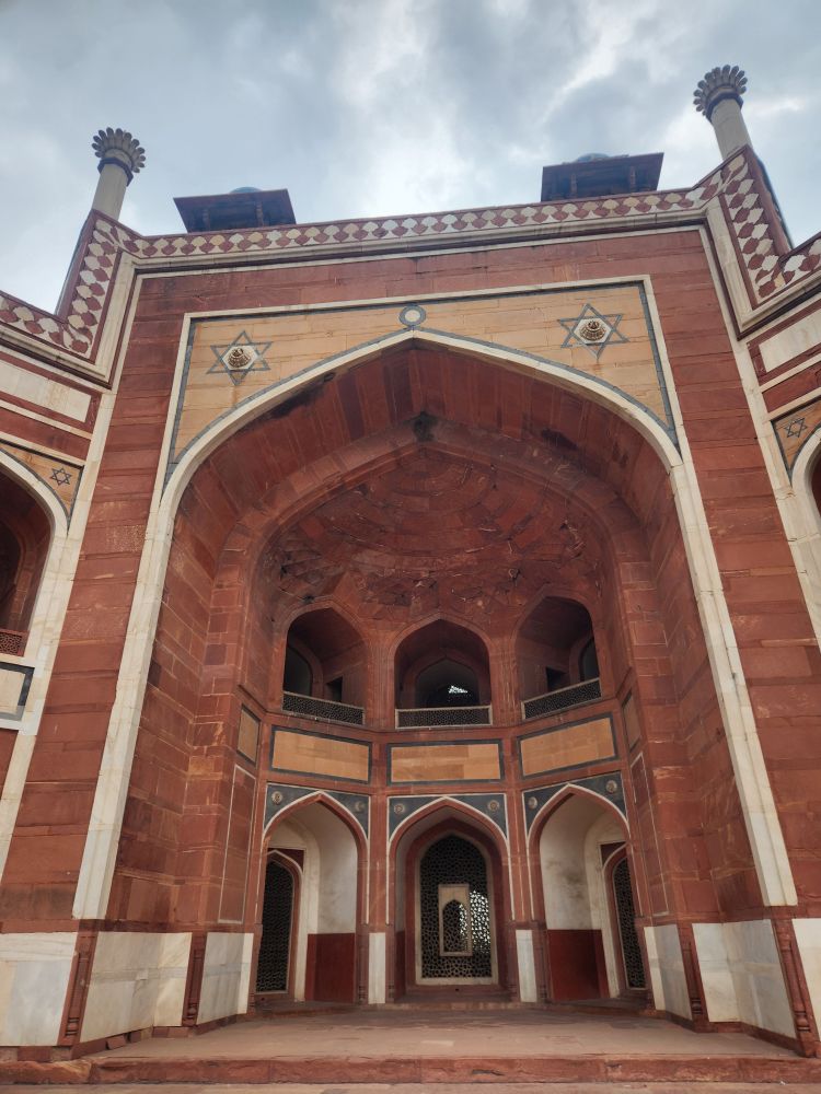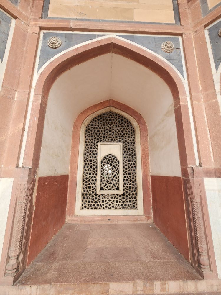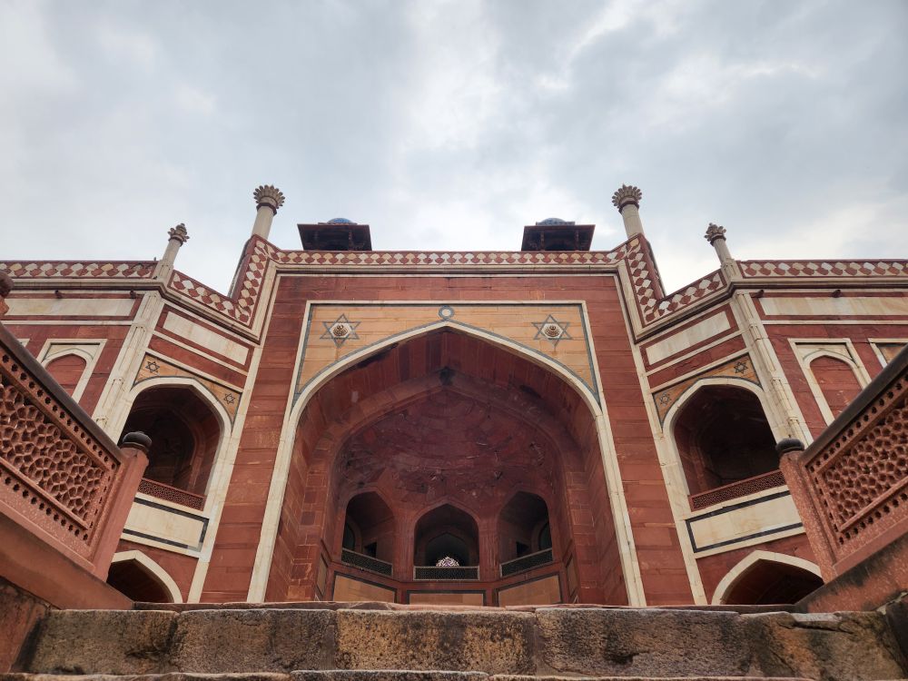 The exterior views of the tomb, from the raised square surrounding the main edifice truly remind us of the Taj Mahal – same design, different stone – otherwise? Absolutely you can see the inspiration. From up here too, you can view the Barber’s tomb. Yes, the Barber’s. Although it predates Humayan’s tomb, legend has it that Humayan loved his barber so much, his tomb was built and prominently placed on the grounds in close proximity to where the main structure of Humayan’s tomb would eventually be built.
