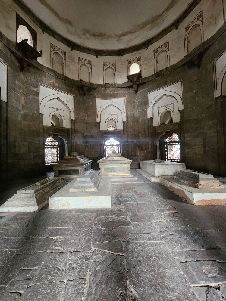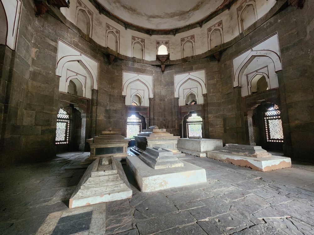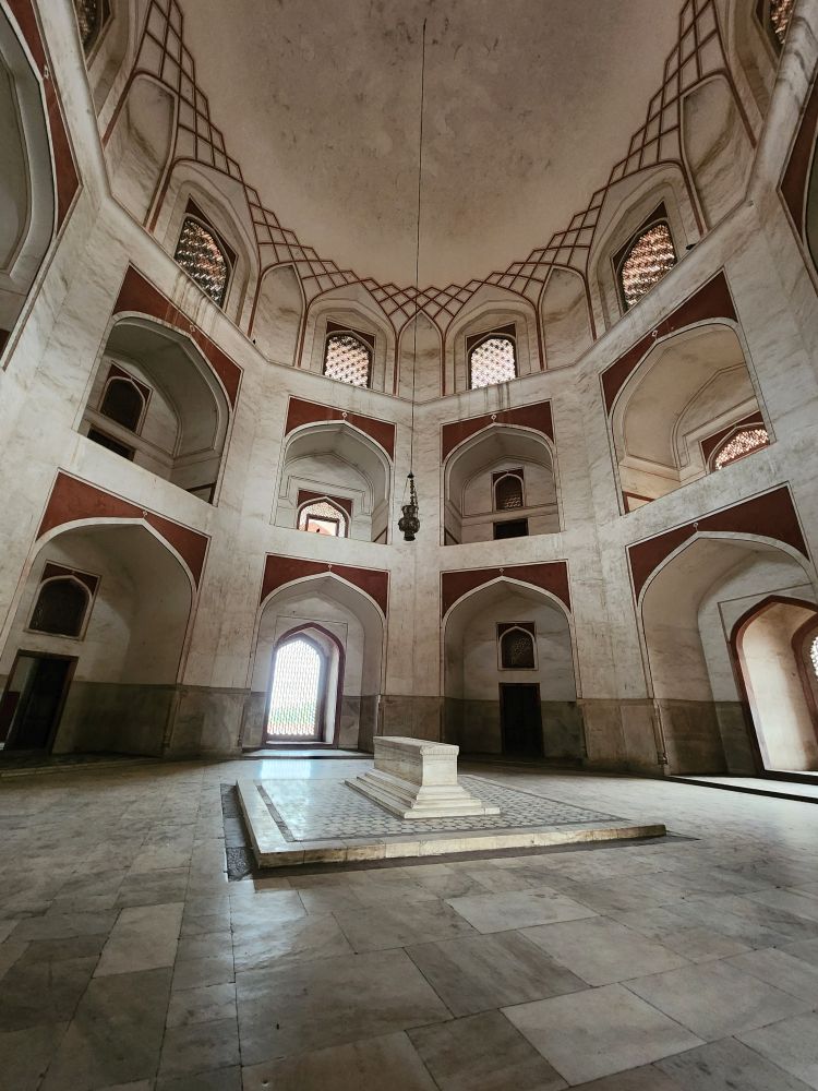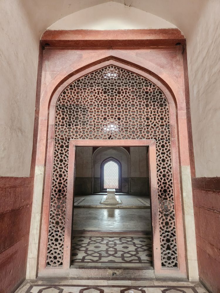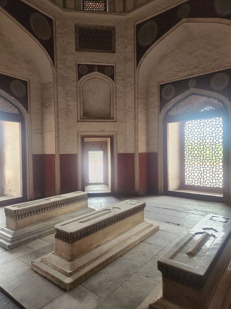 Inside the main octagonal tomb is the burial chamber of Humayun, the second Mughal Emperor. The cenotaph is aligned north to south as is the Islamic tradition. The real burial chamber though is underneath the upper centograph, and not available to the public. In another chamber off to the side are the three burial centographs of Humayun’s wives and a child. It is said that over 150 Mughal family members’ graves are in the tomb, giving it the name, “Dormitory of the Mughals.”