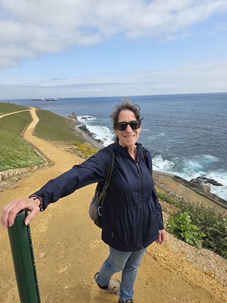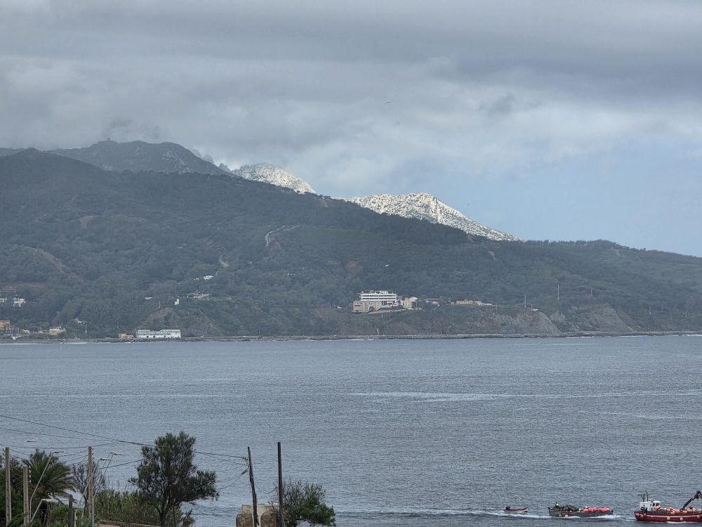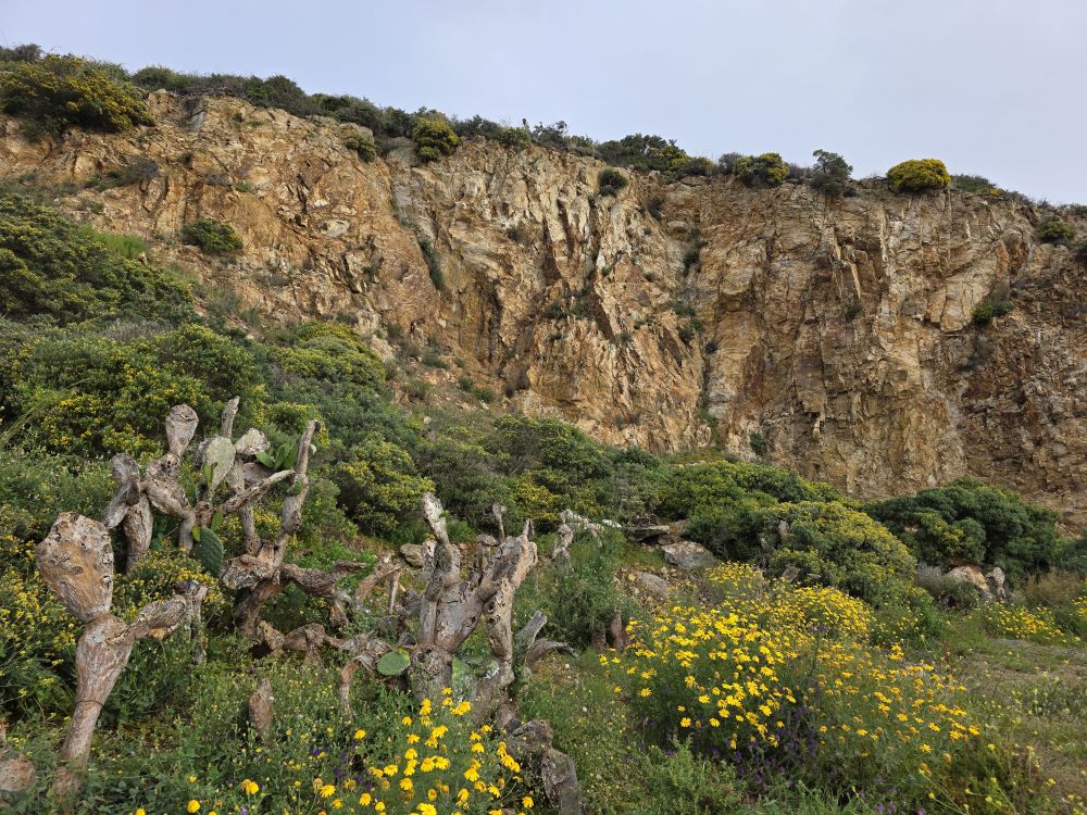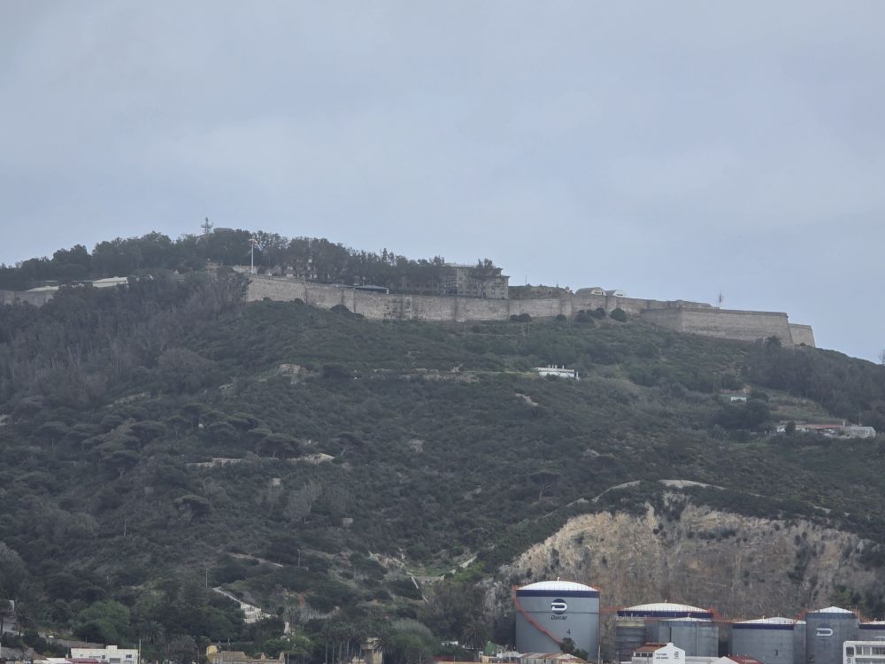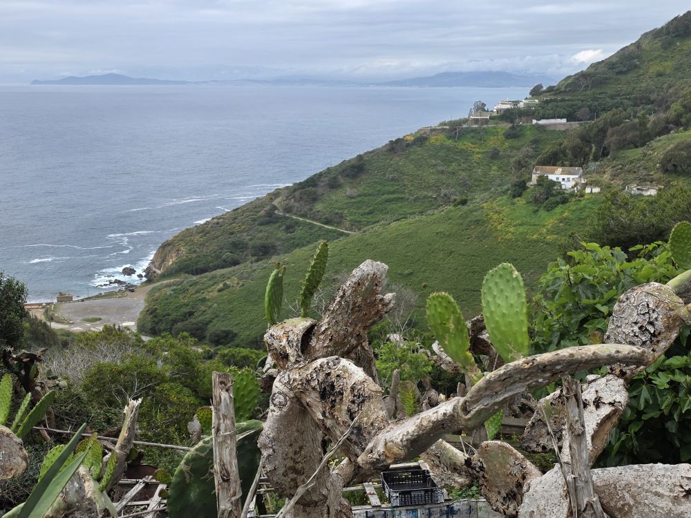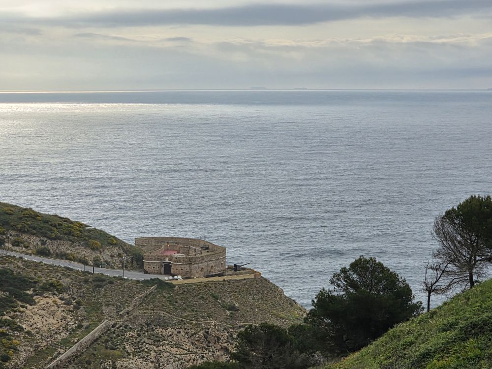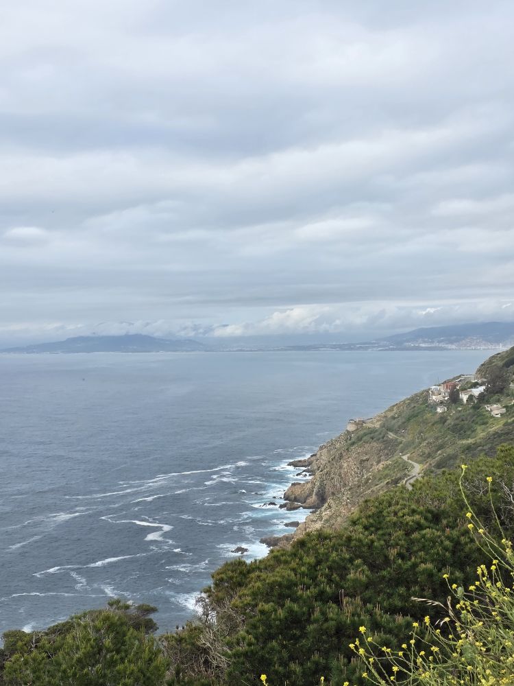 Let the climb begin! We had found this hike on AllTrails and are following those directions to walk the 4 mile route, counterclockwise around the peninsula. There is an elevation gain of 700 feet, which in looking at the maps, comes in phases as we walk this way, with a continuous drop on the other side, making our descent easier than our ascent. We start out following the contours of the wall that surrounds a military facility here, then cut through the front drive of the University to finally arrive at the peninsula on the water side, albeit a few hundred feet above the water. The views across the sea to the Moroccan side of the peninsula are incredible, including the abandoned fort or what have you below us on this side of the water.