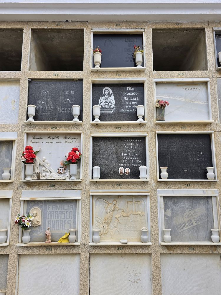 Circling back, we exit near the cemetery entrance, opting to go into the lower entrance to avoid a funeral beginning at the main gates. A typical Spanish style cemetery, with crypts and engraved tombstones rose above us on different levels of hillside. Because it is Labor Day, and so many people have a work holiday today, the cemetery is quite busy with other mourners as well. We aren’t comfortable wandering through as spectators while others are here paying their respects to their deceased, so we snap a few photos then head back into the city.