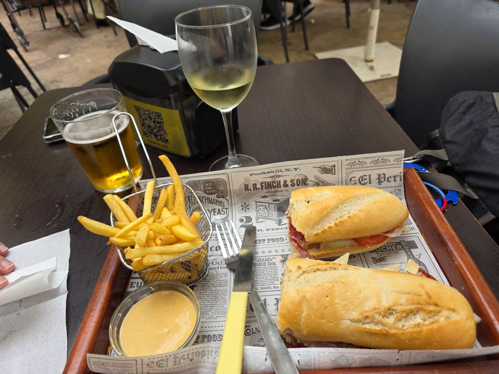 At this point we are getting hungry and are trying to find someplace to eat. It’s too early by Spanish standards, and the one restaurant we try isn’t serving food until 1pm. On we go. Looking up and down the streets that extend off the main pedestrian area. Most restaurants are either not open, or not serving yet, until we luck out at Correos Café, where the Captain and his family are eating – as well as a bunch of other cruise passengers. Eh? Not normally our thing – you know us and local off the beaten path – but on a holiday, at this time of day? Any serving café is the place to be! And it’s a great meal. Al fresco on the little square outside, we had excellent croquettas and a baguette Iberica that was perfect.