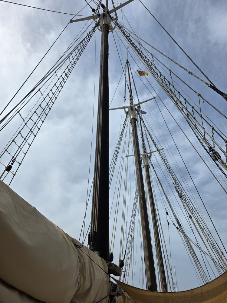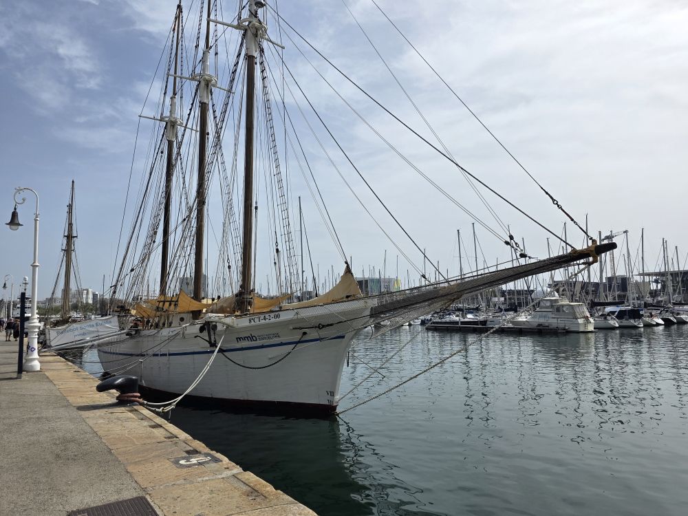 An excellent visit for our short Barcelona day. Outside in the fresh air, we head toward the Santa Eulalia Schooner, which is fortuitously right on the way to History of Catalunya museum. Passing the Christopher Columbus statue and the port building, we arrive at the harbor and board the Santa Eulalia, a 100 year old sailing ship, one of the last to be used for transporting goods in the Mediterranean. 47 meters long and 8.5 meters wide, she has 12 sails and can carry a maximum of 30 passengers. It’s cool to walk around her – but um, no way we’d be sailing her! We could almost get sea sick just wandering around – and she’s hard alongside the dock! We’d never be good sailing sailors – no how, no way. But it’s fun to at least see the inside of a boat like this.