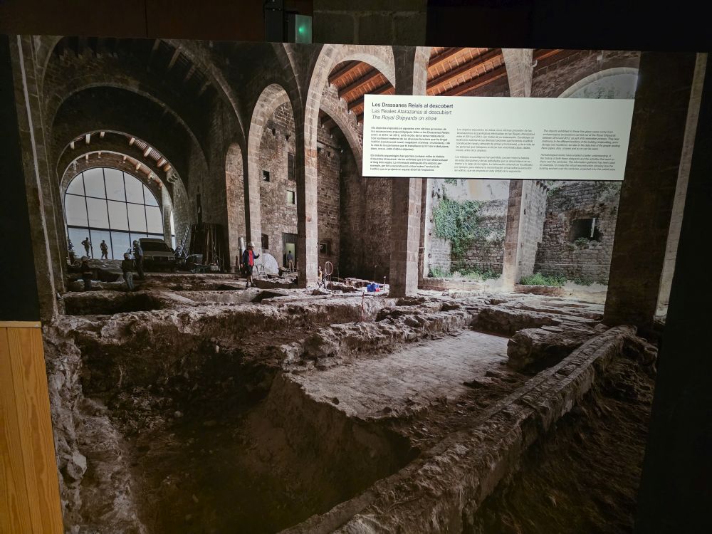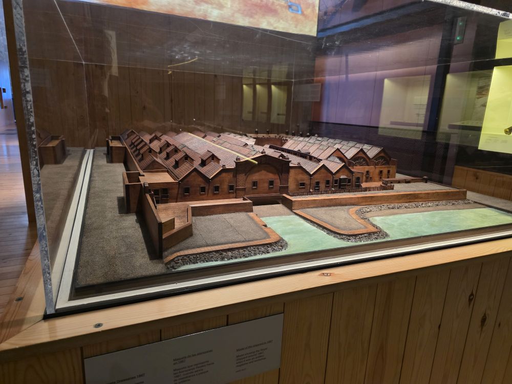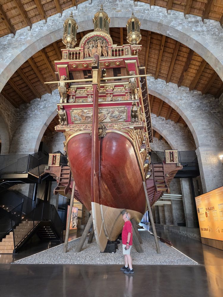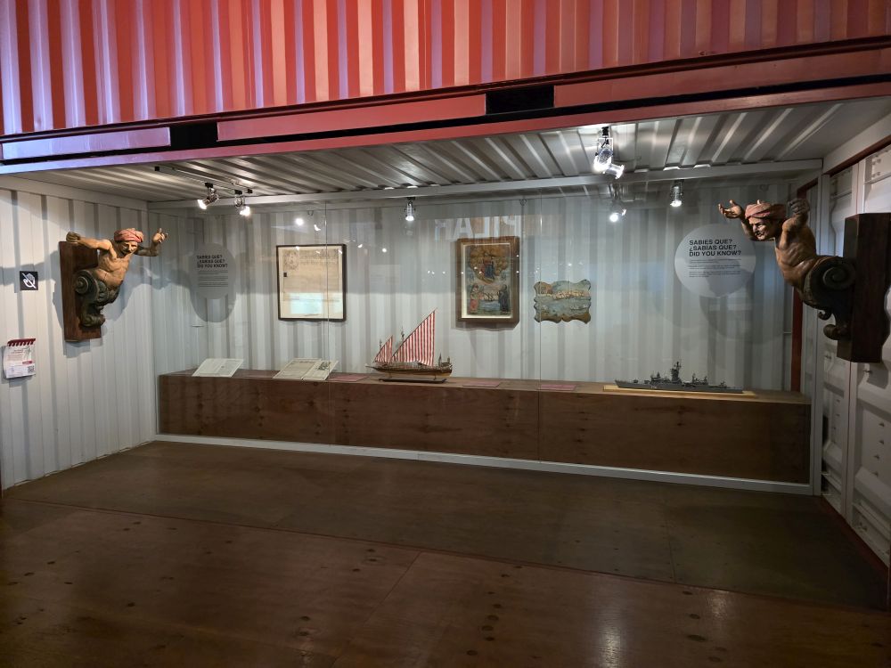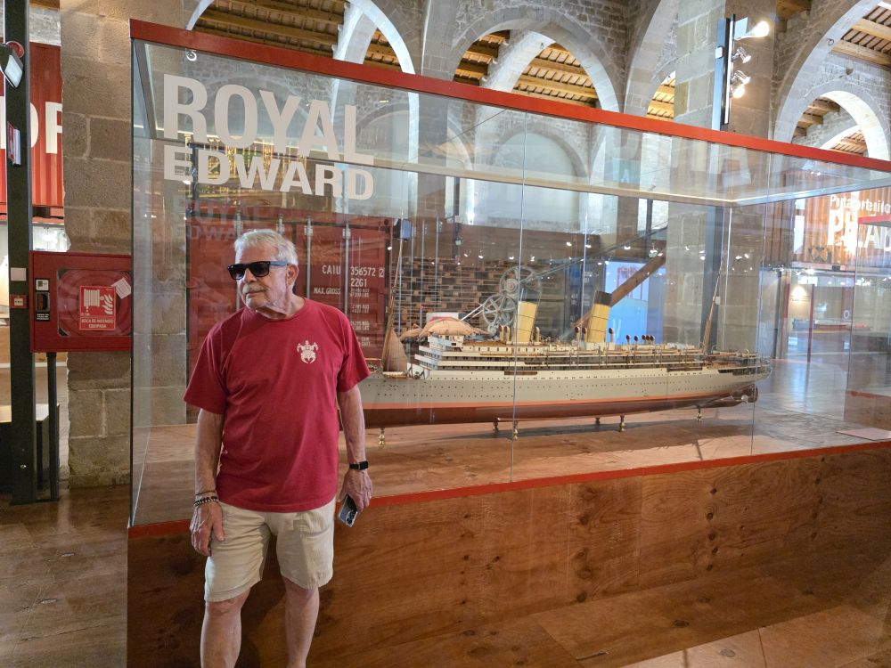 We are the first to enter the museum and begin, what was for us, an excellent hour plus walk through the history of shipbuilding and shipping in Barcelona. We first went through the temporary exhibit all about the Catalan participation in the Atlantic Slave Trade – both passing through and used by Catalan business owners in other parts of the world, then into the main exhibitions beginning with 7 Vessels, 7 Stories. This interactive exhibit is narrated by 7 different types of passengers/crew about 7 vessels. Everything is set up in a shipping container, and the narration, a TV screen attached to a container, begins when you walk us (started by a motion detection system). Not only is it a fascinating exhibit, just the sheer creativity of the design and materials used in combination with the actual building make it a stellar museum to visit. We are enthralled. Especially when we find the model of the Royal Edward Packet boat. How could we not be?