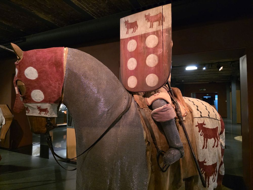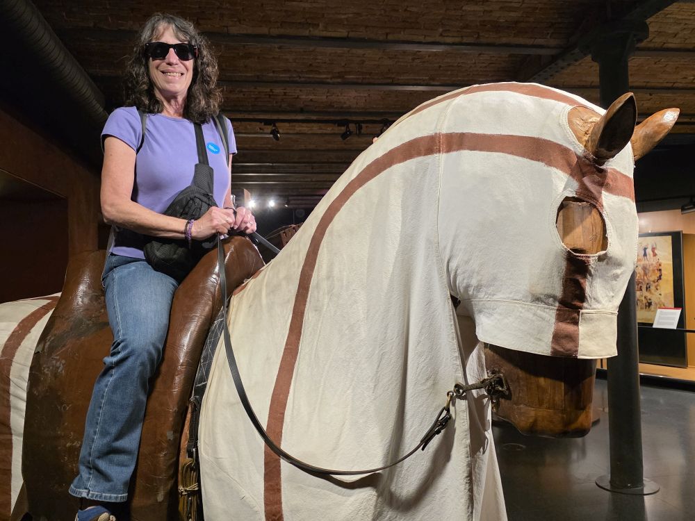 Continuing down the harborside, we reach the history museum without incident and begin our exploration of Catalunya history. Here again, this museum has some of the best displays, both interactive and creatively static. Everything looks so real. There is a section on the Moors and the expansion to, then retreat from, Europe. One interesting note: the name Andalusia apparently is named as such from the 9th C al-Andalus Calphate established a strong hold in that region. Another section had realistic statues – life-size – of knights in their armor and their steeds. There was even one horse you could mount to get a feel for the sheer girth of the thing. You know I’m not resisting that! And that horse was huge, I could barely get my legs around it.