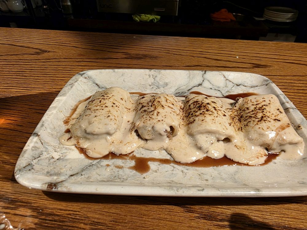 The whole museum was really interesting and informative, and if it weren’t for our short port call, probably deserves more time. But we don’t have that luxury today, so we are off to grab lunch at our pre-researched Tapas restaurant called Tapeo. The one absolute today is that we must have Canelones – the traditional Catalan kind that I absolutely adore. We had found a few places close by, but man, they were pricey, so when we saw this little Tapas bar, we figured it was worth the 15 minute walk up through the Gothic area. Tapeo was also one of the few places that opened at noon – which we needed to get back to the ship on time. So, Tapeo it was. The walk was nice, but as we got back into the old town from Barceloneta, you could see how much more crowded everything was getting. Saturday afternoon in Barcelona – it’s what we expected. Arriving at the restaurant, there is a line a mile long across the alley, but when we walk into the restaurant, while packed (with Asians we might add), there are some seats. The waiter asks us if we have reservations. Shit. No. Didn’t really think we’d need them for a Tapas bar…but we get lucky and he allows us to sit at 2 of the last 4 remaining seats at the bar but we have to be done by 2 pm. Not a problem!