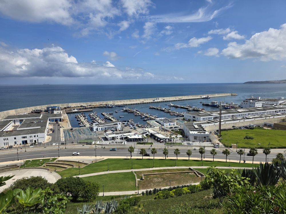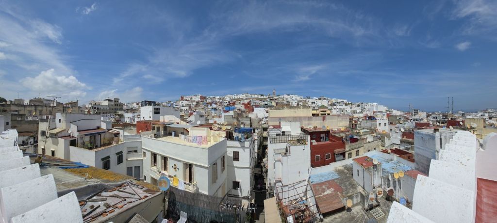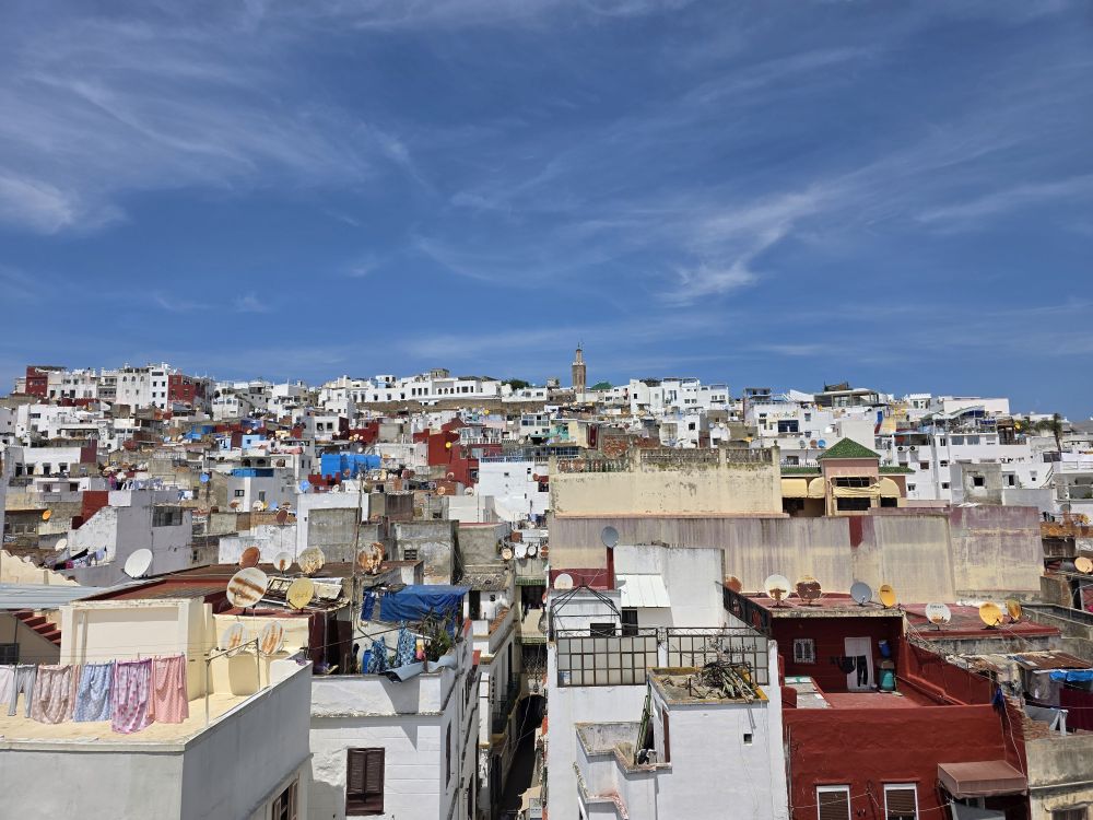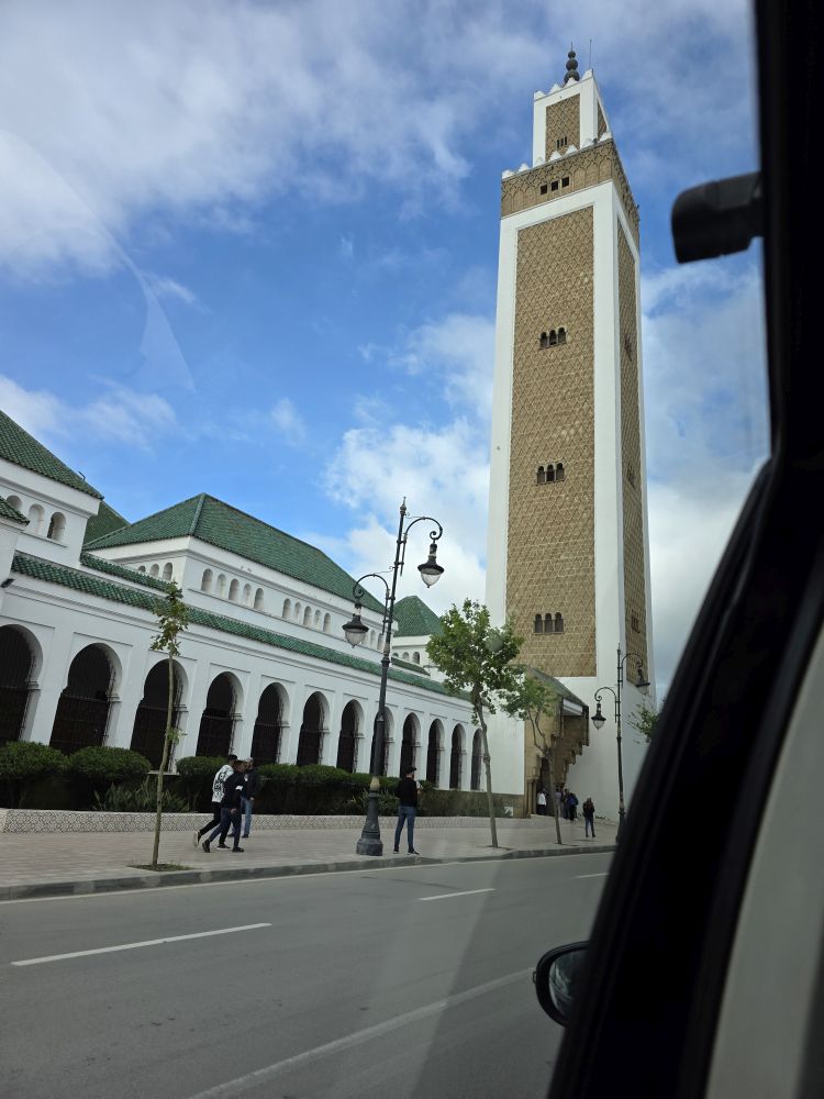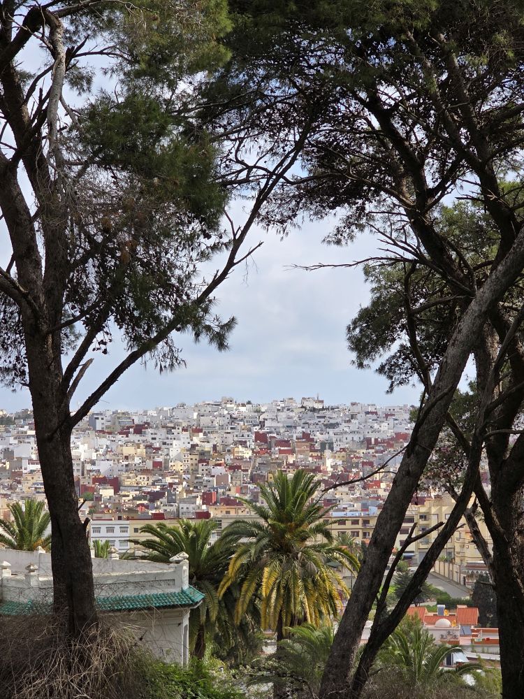 Back in the car we make our way around the city, with Hamid narrating at every corner. We learn he is an 8th Generation Tangerine (as Tangier natives are called), that Tangier is a very cosmopolitan city made up of a peaceful mix of Muslim, Jewish and Christian Catholics. He is very proud that Morocco was the very 1st country to ever recognize the US as a country in 1777. As he narrates, we drive past one of the original mosques in the city (seen through the car window here), then up into an area called California (originally the International Zone from 1923 to 1956, it was filled with foreigners who took to the “California” type lifestyle), and then into Beverly Hills, the rich sections where the 1% live. Here we stop for photos of the city stretching out among the hills surrounding us while Hamid explains the houses are white to help with the heat in the summer, but also to repel insects like mosquitoes and flies. Didn’t know that last piece.