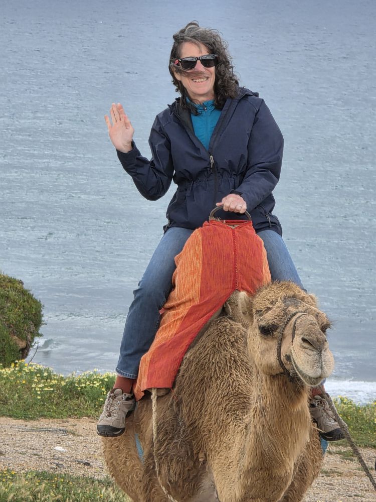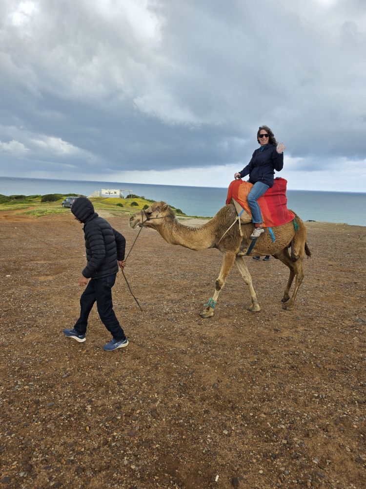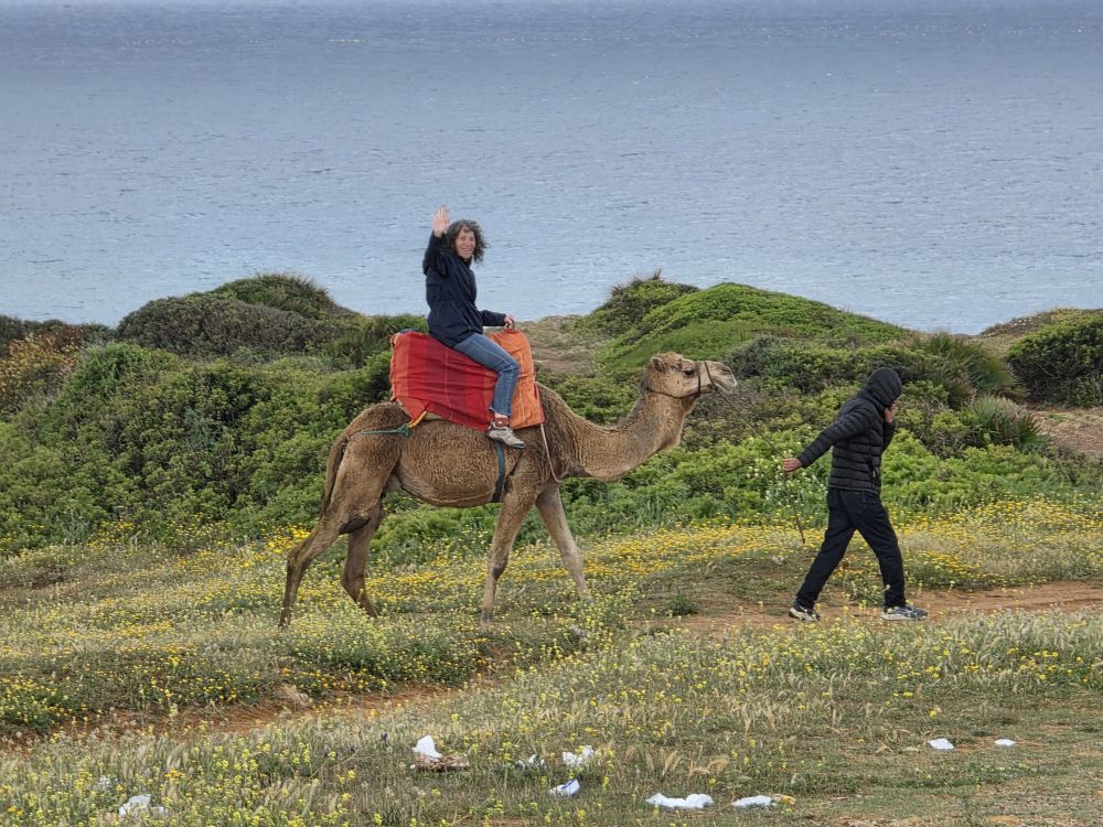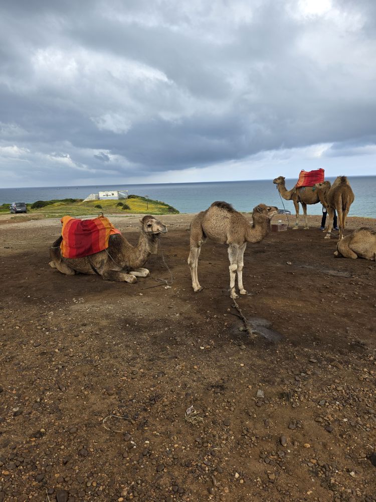 Next we are heading to Cap Spartel, the spot where the Mediterranean meets the Atlantic ocean. Unfortunately, as we approach the parking area, we are waved off by a police officer because the King of Saudia Arabia is coming. Okie dokie then – we’ll move on, heading toward the Terrasee des Dromadaires – the Camel Terrace! On the way, we do in fact get passed by the King’s motorcade, just like the US President’s motorcade, complete with its own ambulance. We also pass Cinghiale on the side of the road! Wild boar anyone?