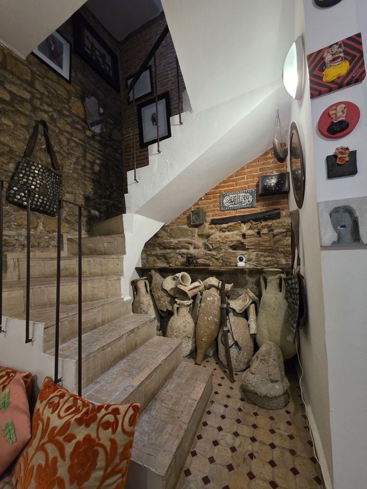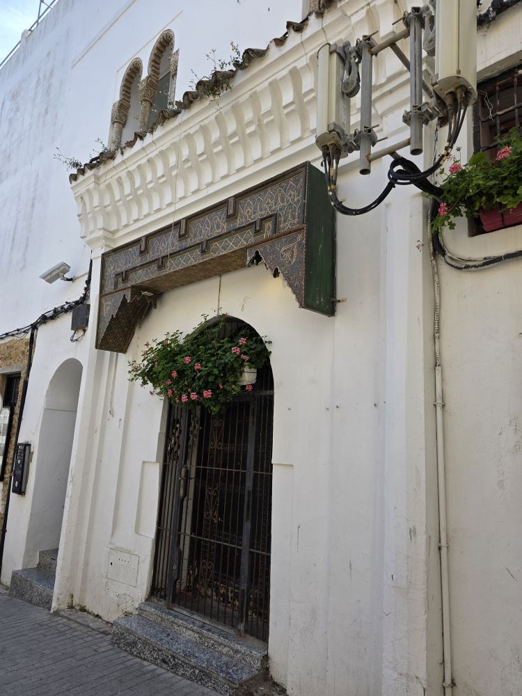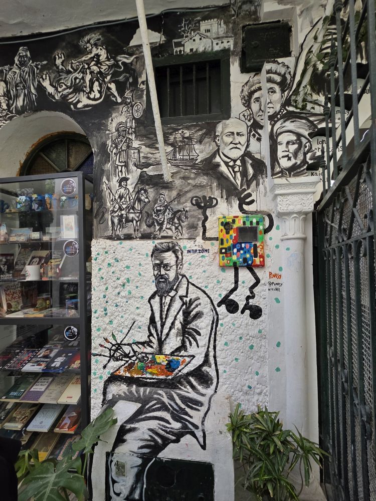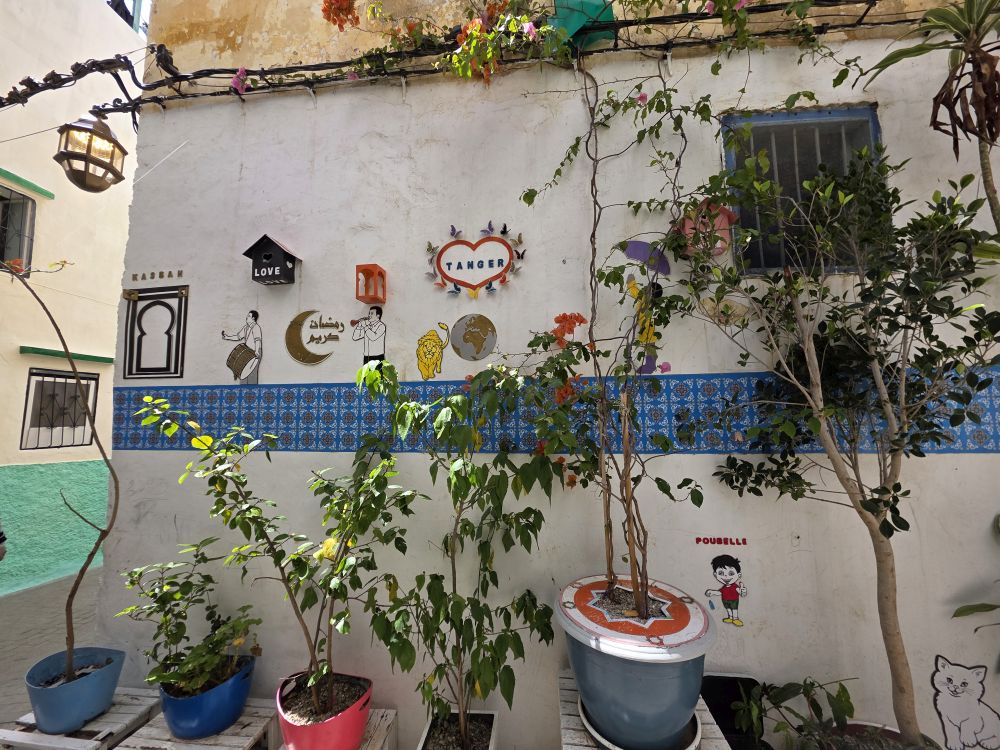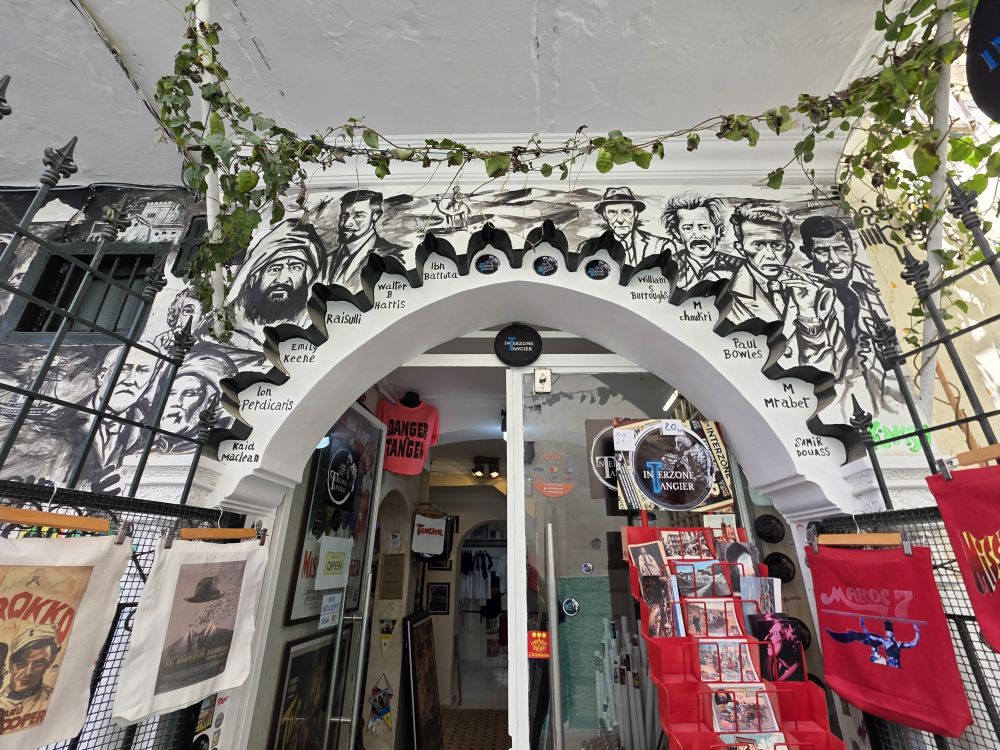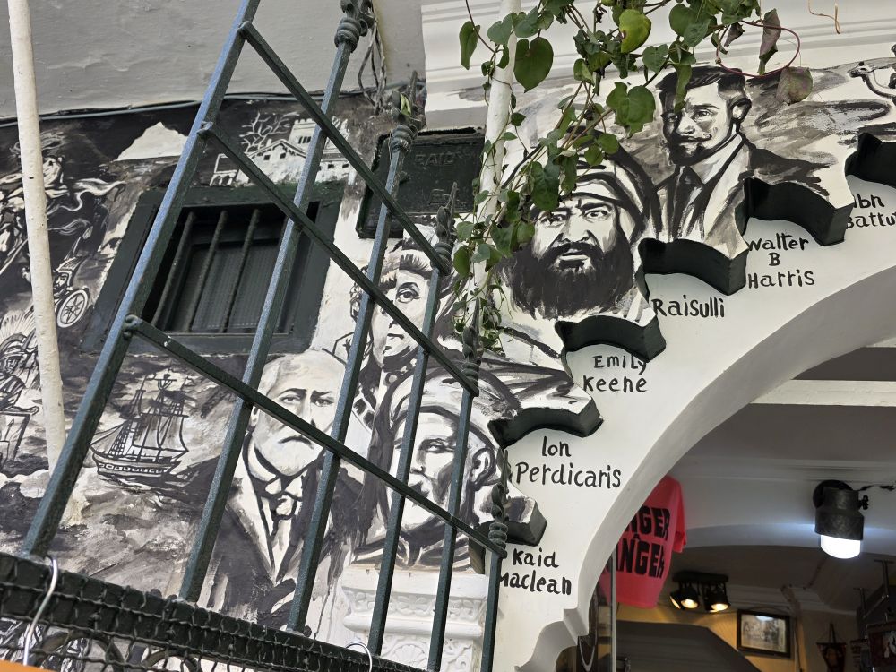 Now we are onto the Medina, the Kasbah, talking a speed walking tour through the narrow windy little alleyways and streets. All white washed and glowing in the sunshine, with gorgeous tiled buildings, lush potted plants and fun stores, like this novelty store with the great “head” mural depicting all the famous people in the history of Tangier.