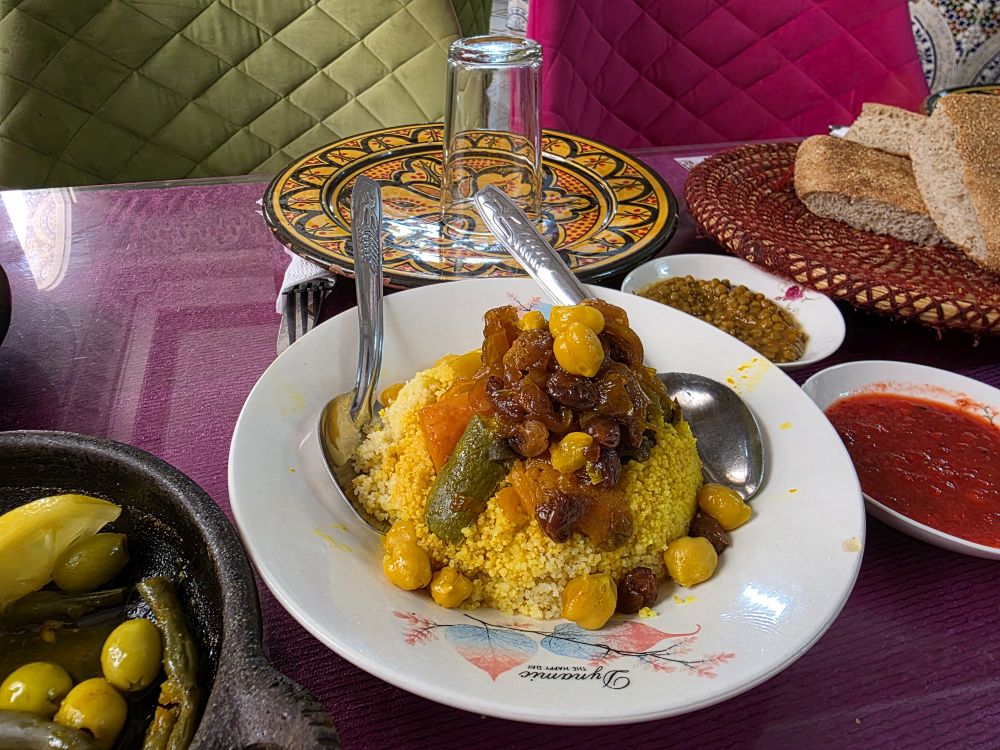 Ending up at the Restaurant Vandalucia, we sit down to a tradition prix-fixe lunch of delicious Moroccan specialties: bread, olives, tapas and snacks to start; some sort of soup with a side salad with beets (yay, beets); chicken pastilla (an excellent flaky phyllo dough triangle filled with minced chicken and topped with powdered sugar and cinnamon – strange combo, but oh so good); chicken tangine (which I totally forgot to photograph); little lamb meatballs; couscous with raisins and chickpeas (that we had originally passed on because there is enough food on this table, but that the waiter insisted we have – what you see is his version of a “small” portion, ha!); and finally dessert (of course, how can you not have dessert?) of fruit and chebakia, a popular Moroccan treat of fried dough coated in syrup and sesame seeds. Oh so good, and oh so bad!