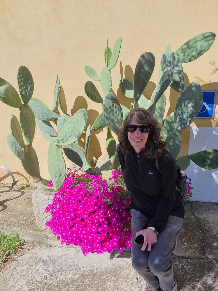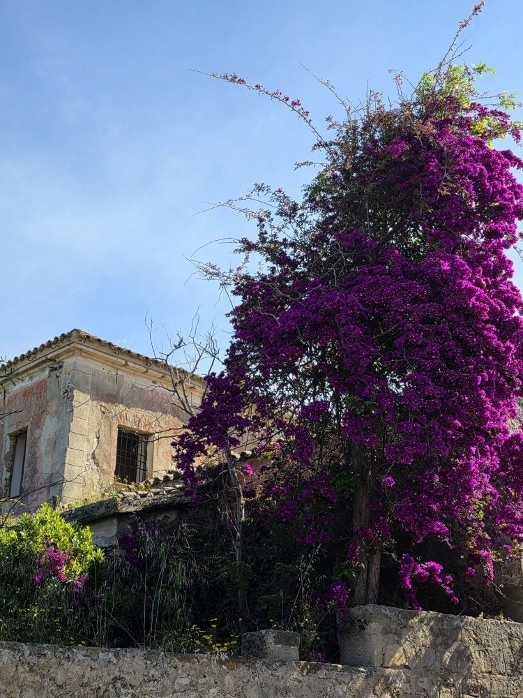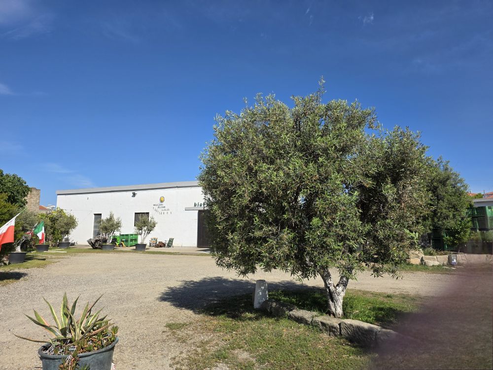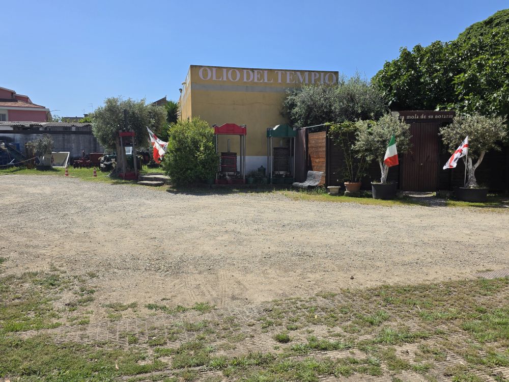 Continuing on through the town, we easily find our destination goal: The Museo dell’olio Sa mola de su notariu – Olio del Tempio (The Olive Oil Museum and Notary Mill – Oil of the temple). Inside a large courtyard are two buildings – one a museum, the other a working olive oil refining plant. We’d read great things about the museum, the tour and the olive oil tasting. We arrived a little before the 10am opening time, passing the time by taking pictures of the gorgeous flowering shrub and buildings surrounding the courtyard. But sadly, the 10am hour comes and goes with no one about – the place remained locked up tight – even though everything we read said they were open daily. There is at least a phone number we can call – so we WhatsApp’ed them to see if we could get a tour, hoping they would respond.