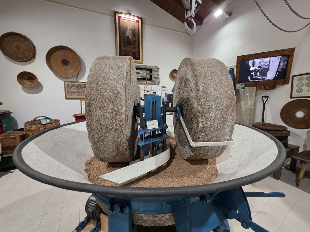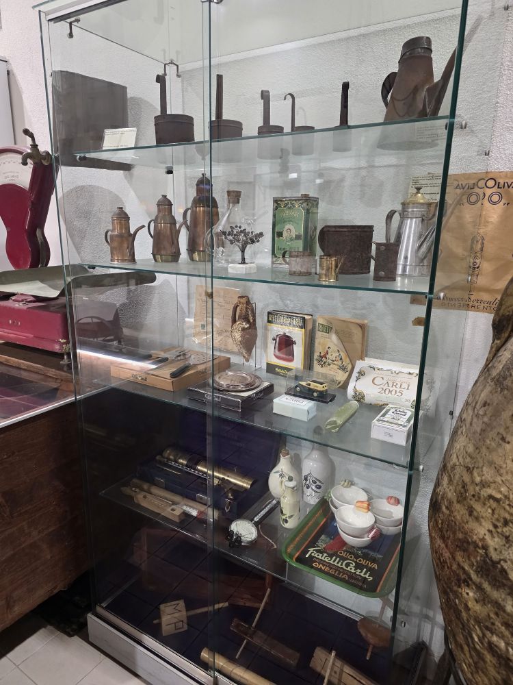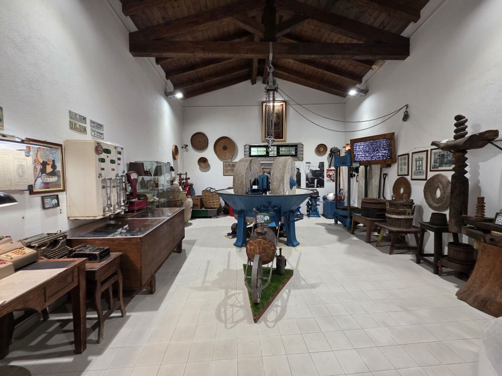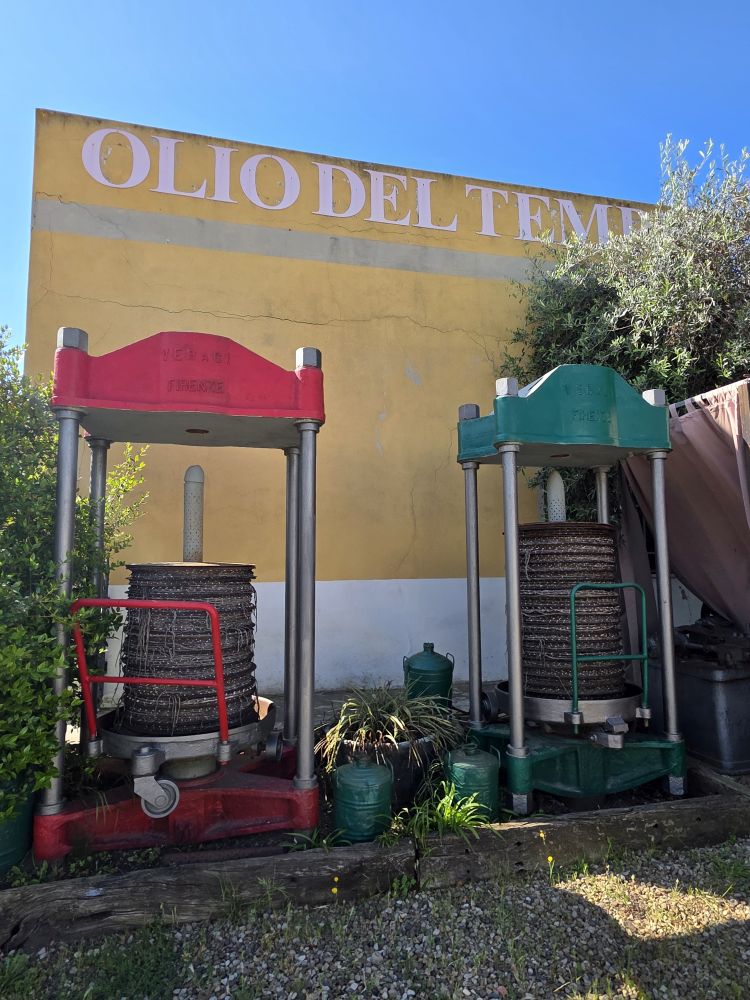 Arriving back at the museum, the factory door is open but when we peek in, it appears to be empty. As we turned to leave, out of the office pops Francesco, the 4th generation owner who greets us and then shows us around. He had opened specially for us! How cool is that? Francesco led us into the museum on the other side of the courtyard and gave us a full presentation on Olive Oil, including tastings of 4 different types – explaining each as we went along. He explained all the processes of making the oil: olives are washed, crushed to create a paste, then crushed to break down the pulp cells to release the oil, then the water, pulp, olive skin and seeds are separated out, and the paste is finally put into a centrifuge to separate out the oil; what to look for and how to do a tasting correctly: Fruity, bitter, peppery tastes; warm the olive oil tasting cup in your palms before trying it. Too fun!! Then he walked us through the museum which chronicles the history of his olive making family – complete with all the old machinery, tools and videos showing how the processing was done over the years.