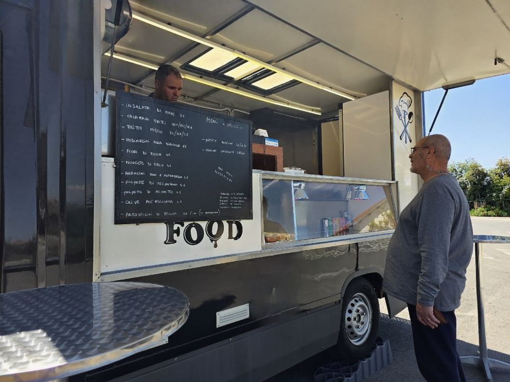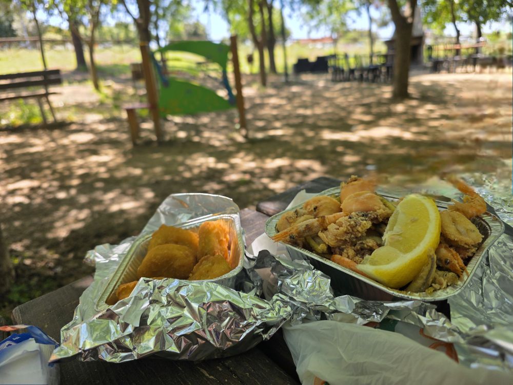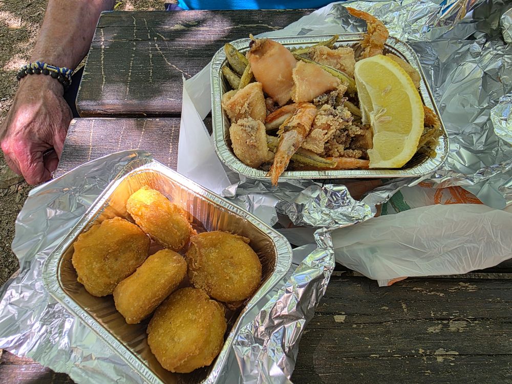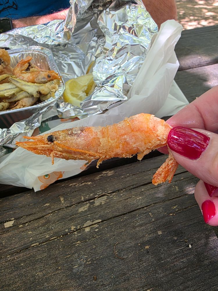 Figuring we’d head back to Cagliari to find lunch, as we arrive at the parking lot we find a food truck there. Serendipity. There was a little park across the street we saw as we walked into town and thought it would make a great place to picnic. At the time, though, we had no picnic food. Now we do!! Fritto misto (mixed fried fish – yes that is a whole shrimp, and yes, we ate it whole, just like you see it) and nuggets a pollo. Perfect, inexpensive lunch. In a great setting.