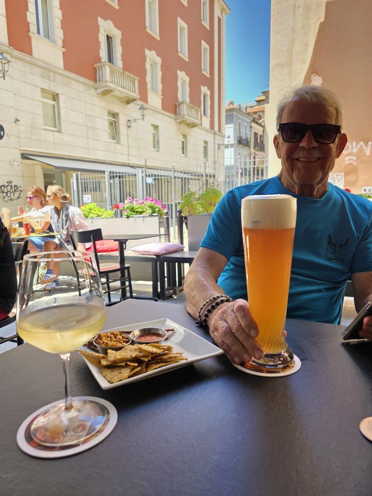 Once back into town, we deposit the car on the square in front of the train station, then wandered around a bit. Just wasting time, enjoying the day, the architecture, the ruins of the Church of Saint Lucia. We end up plopping down at a little café and bistro for a beer and wine – and complimentary snacks. Perfect after lunch nibbles and beverages.