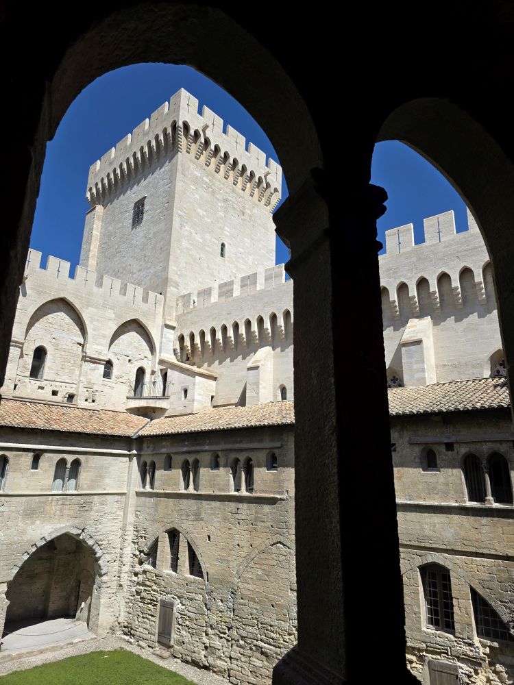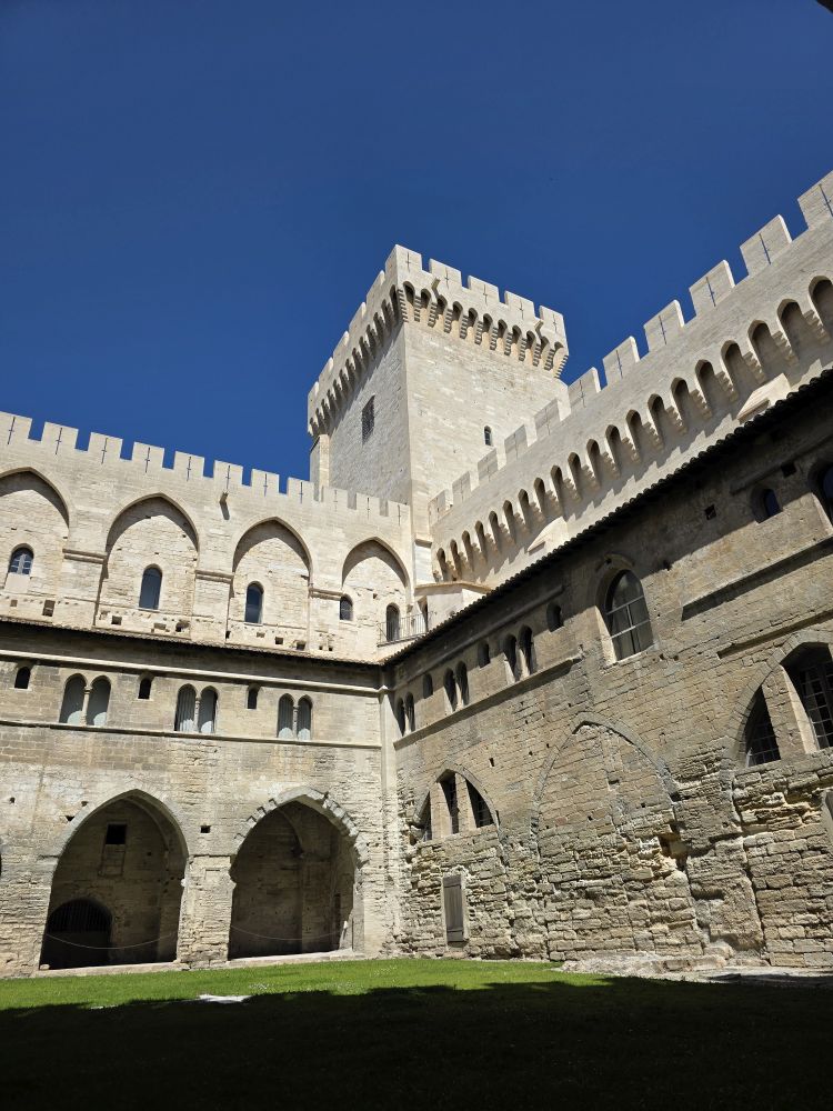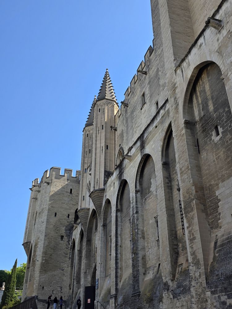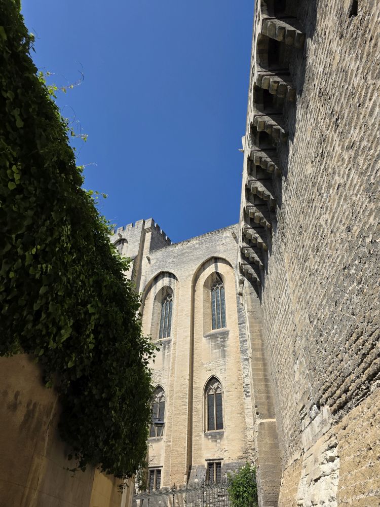 Congregating in the Place de l’Horloge, Phillippe gives us our meeting time to return to the bus, then offers to take us on a walking tour of Avignon. Um. No thank you. We want to have time to actually do something, and clip-clopping along isn’t our idea of a good time. So, we’re off on our own – snapping pictures of the city hall and theatre buildings before heading to the Palais de Papas – the Pope’s Palace – to tour the seat of the Christian world in the 14thC. One of the biggest medieval Gothic Palaces in all of Europe, the Palace was the papal residence to 9 popes and 6 papal conclaves, ending with Benedict XIII. Once a fortress and a palace, the over 160,000 sq ft of space, along with its architecture of strong crenellated walls, tall towers, support arches and ability to withstand heavy sieges make the building one of the most important in the world.