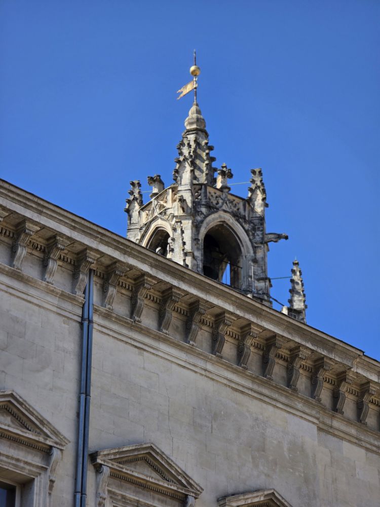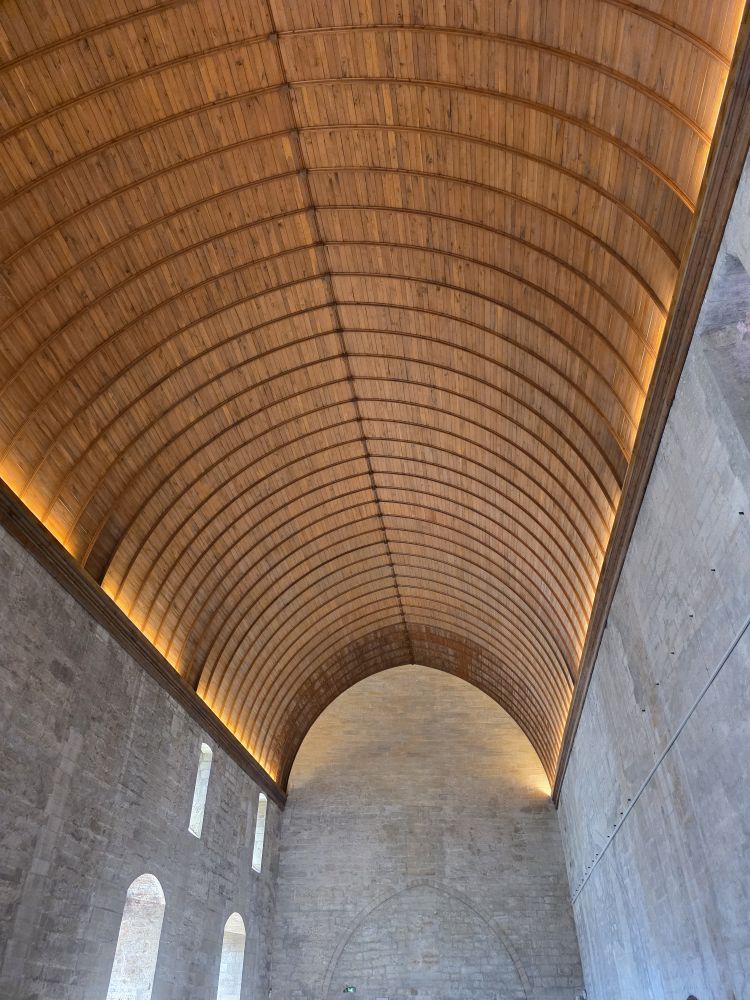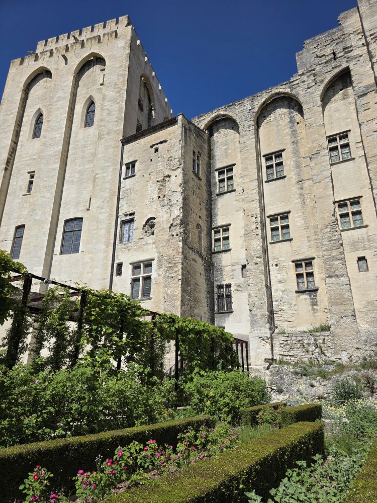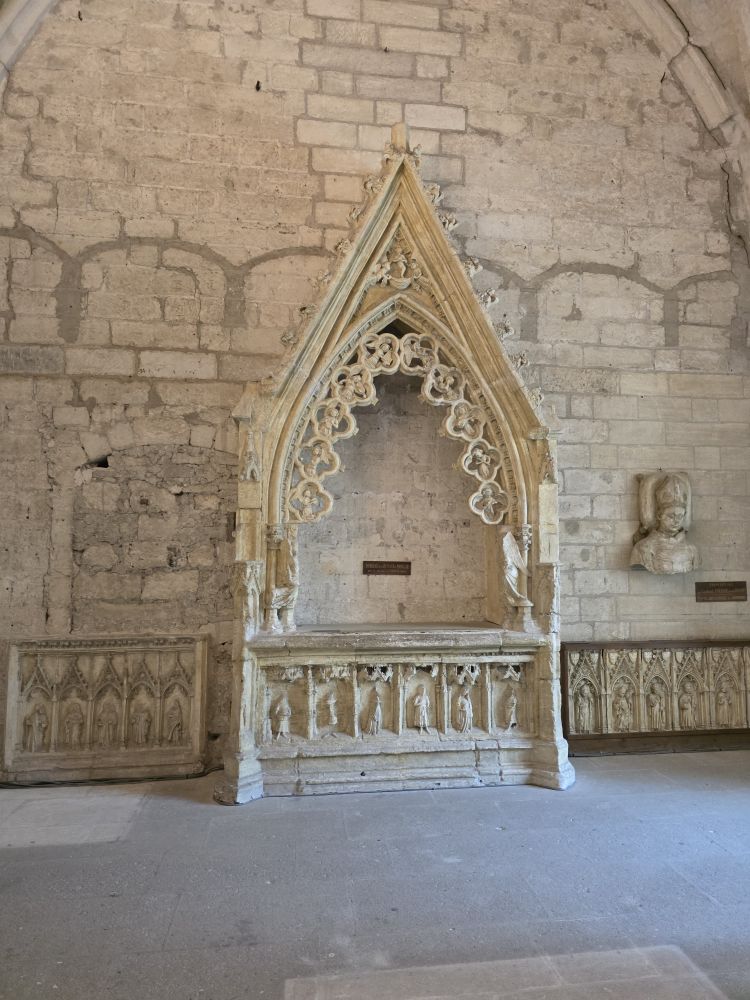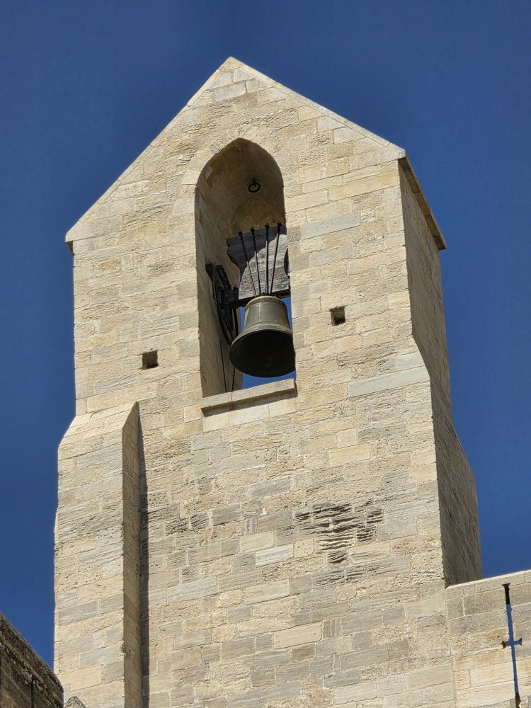 Congregating in the Place de l’Horloge, Phillippe gives us our meeting time to return to the bus, then offers to take us on a walking tour of Avignon. Um. No thank you. We want to have time to actually do something, and clip-clopping along isn’t our idea of a good time. So, we’re off on our own – snapping pictures of the city hall and theatre buildings before heading to the Palais de Papas – the Pope’s Palace – to tour the seat of the Christian world in the 14thC. One of the biggest medieval Gothic Palaces in all of Europe, the Palace was the papal residence to 9 popes and 6 papal conclaves, ending with Benedict XIII. Once a fortress and a palace, the over 160,000 sq ft of space, along with its architecture of strong crenellated walls, tall towers, support arches and ability to withstand heavy sieges make the building one of the most important in the world.