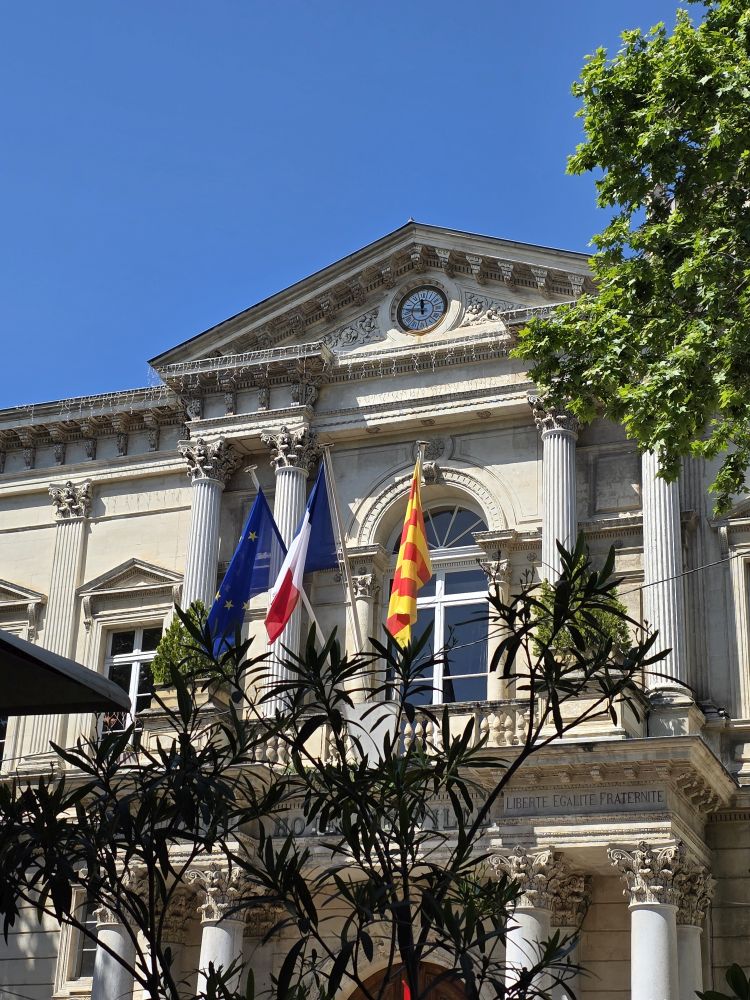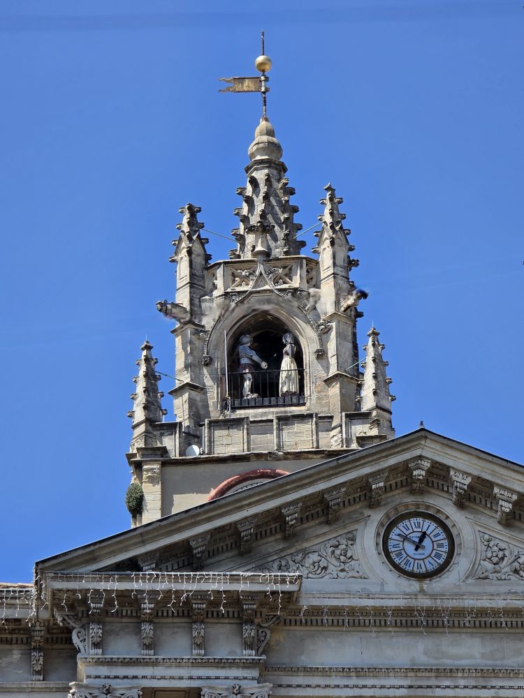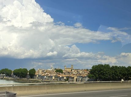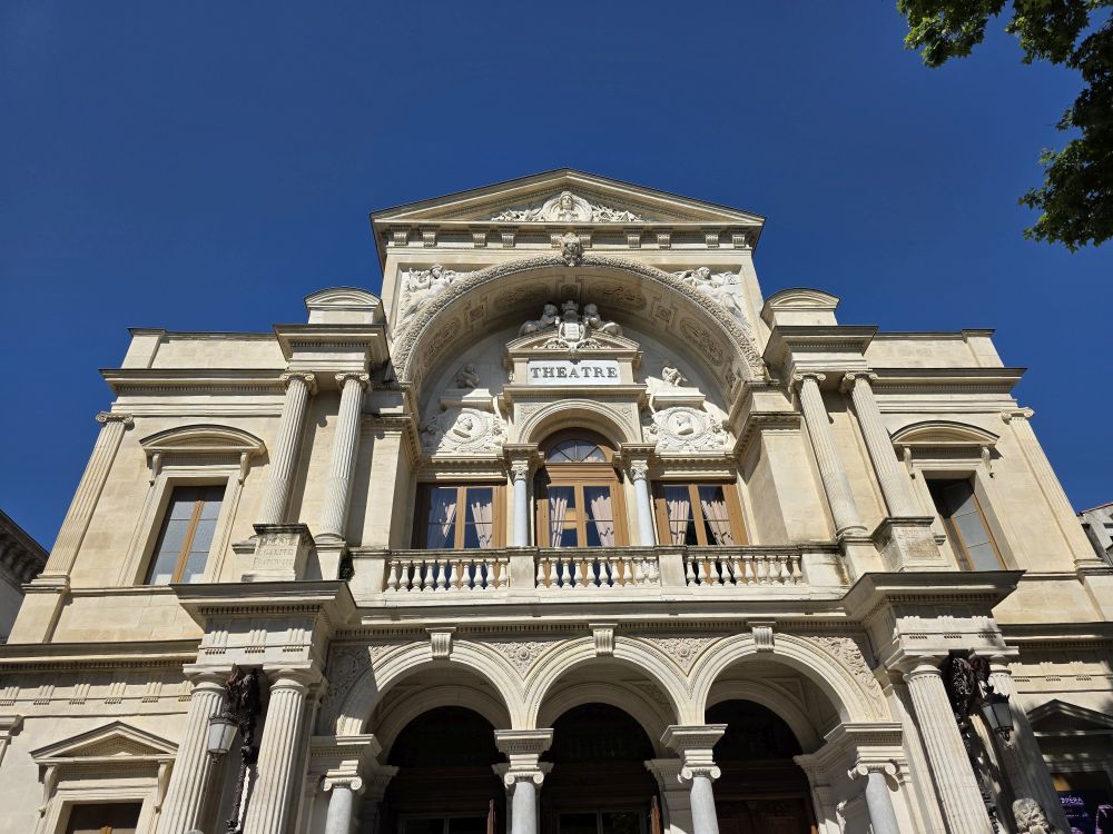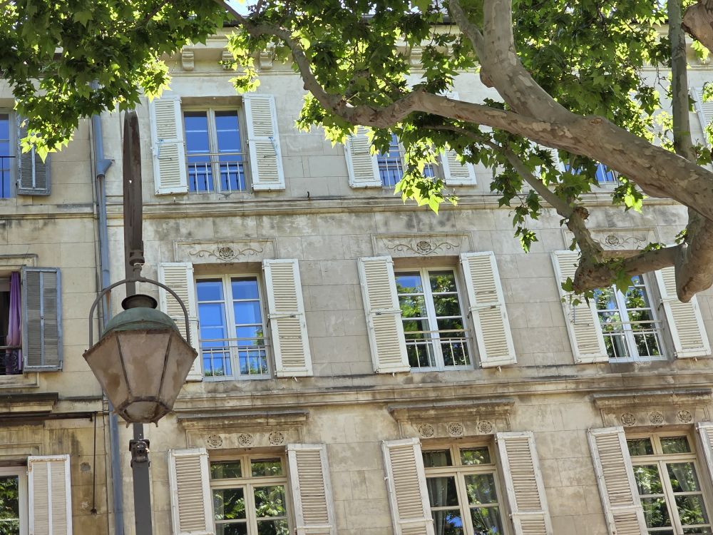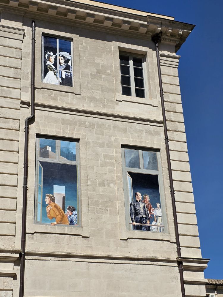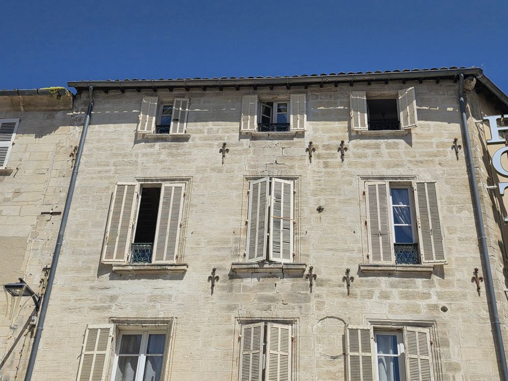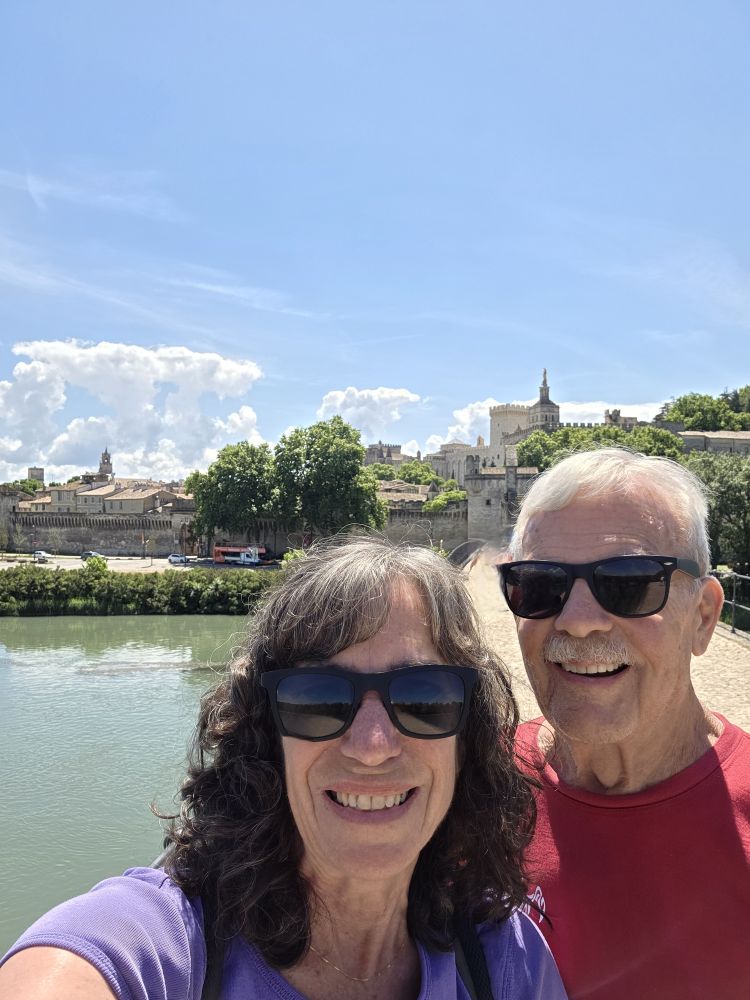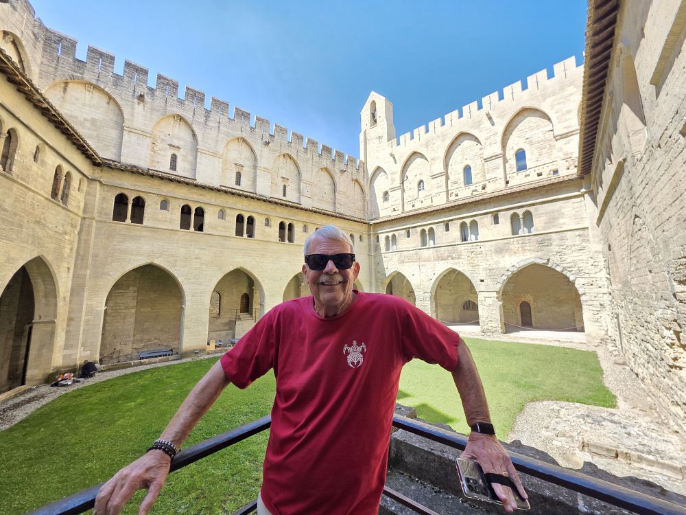 The bus ride takes about 90 minutes, during which we listened to Phillippe, our guide who gives us quite the history of this area – a long dissertation on the history of French popes, also war and maybe crusades? Don’t know, didn’t really listen. And quite frankly couldn’t really understand some things because of his accent (Think he might have made a joke about Trump and 3rd term but not sure) – plus after our hysterically fun Florence guide, this delivery was a tad boring. Arriving in Avignon, Phillippe takes us on a walk into town. A very slow walk. First time ever the guide walked slower than the group! Plus he sort of shuffles his feet when he walks, sounding like a horse drawn carriage, which of course makes us start calling him clip-clop Phillippe. Phillippe has told us he is turning 64 tomorrow – that’s my age! – but he acts older than Moses. Terribly un-French-like!