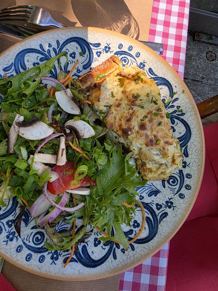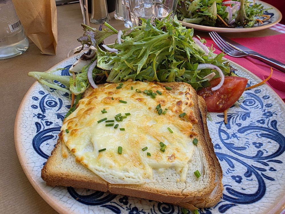 Even though it is early, we still figure we better find a place for lunch before it is too busy and too late. Deciding on La Sperlongaise on the Place de L’Horloge, we plop down at an atmospheric outside table to wait until the noon hour when the restaurant starts to serve lunch. The waiter is adorable, joking around, on top of things, bringing us our drinks so we can wait comfortably until he can take our order of quiche of the day and Croque Monsieur – which on the menu is listed at Croque Mister. Too funny!